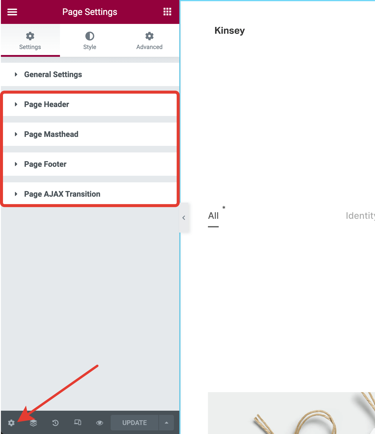 While in Edit with Elementor mode, click on the Cogs icon at the bottom left. Here you will find the available document options under the Settings tab, grouped into four sections: