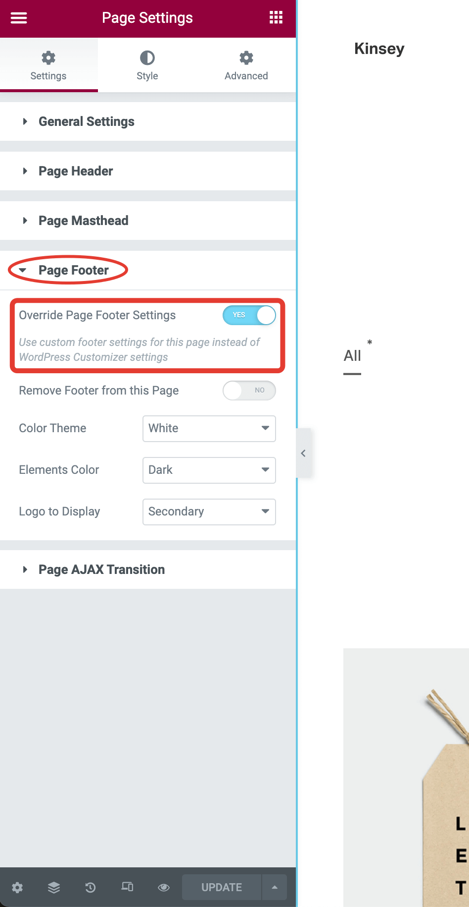 Page header and footer styles can be overridden per page. For example, you can change the footer color for a specific page, aside from others that normally inherit styling from the WordPress Customizer. This may be useful because the theme contains pages with different section color themes.