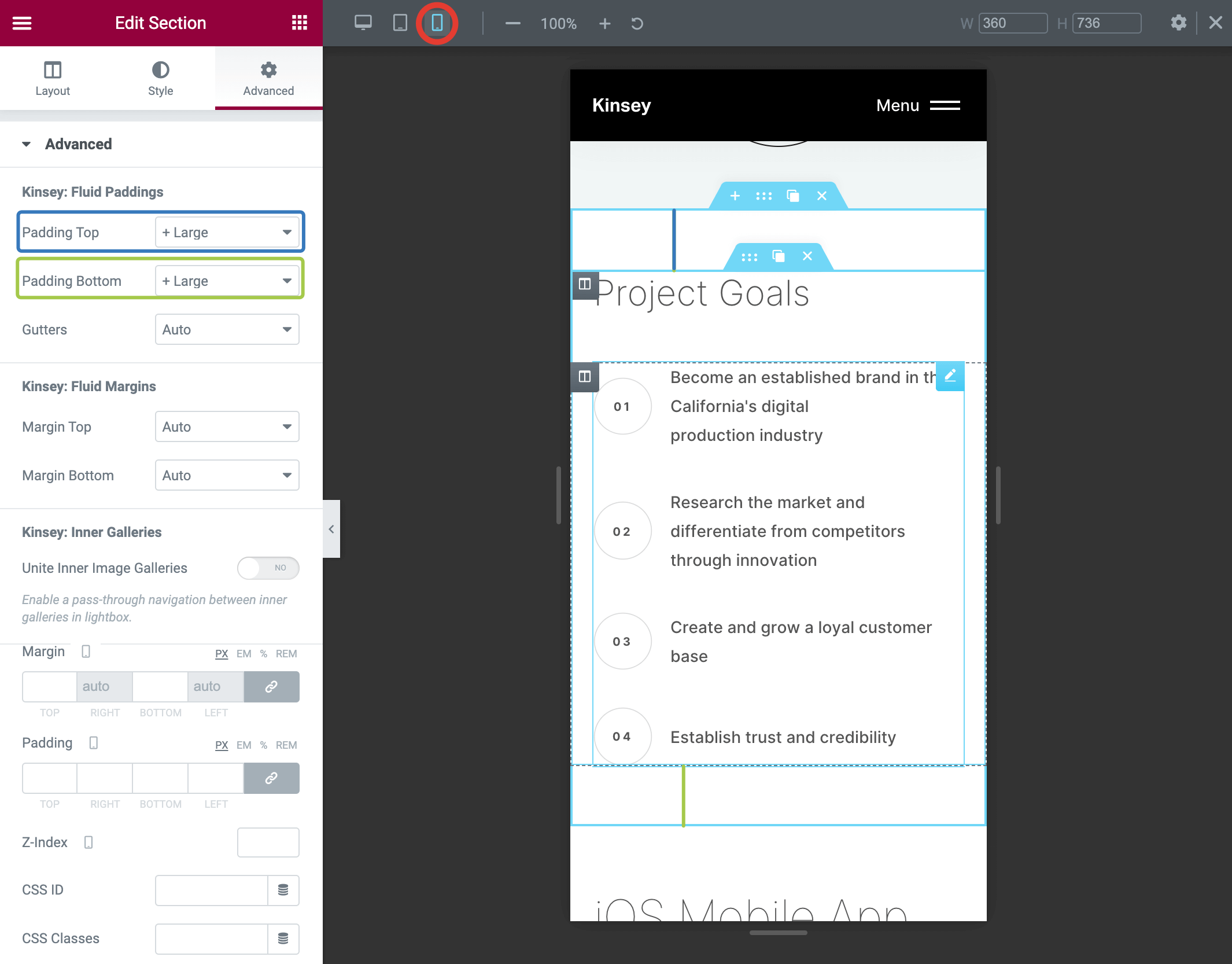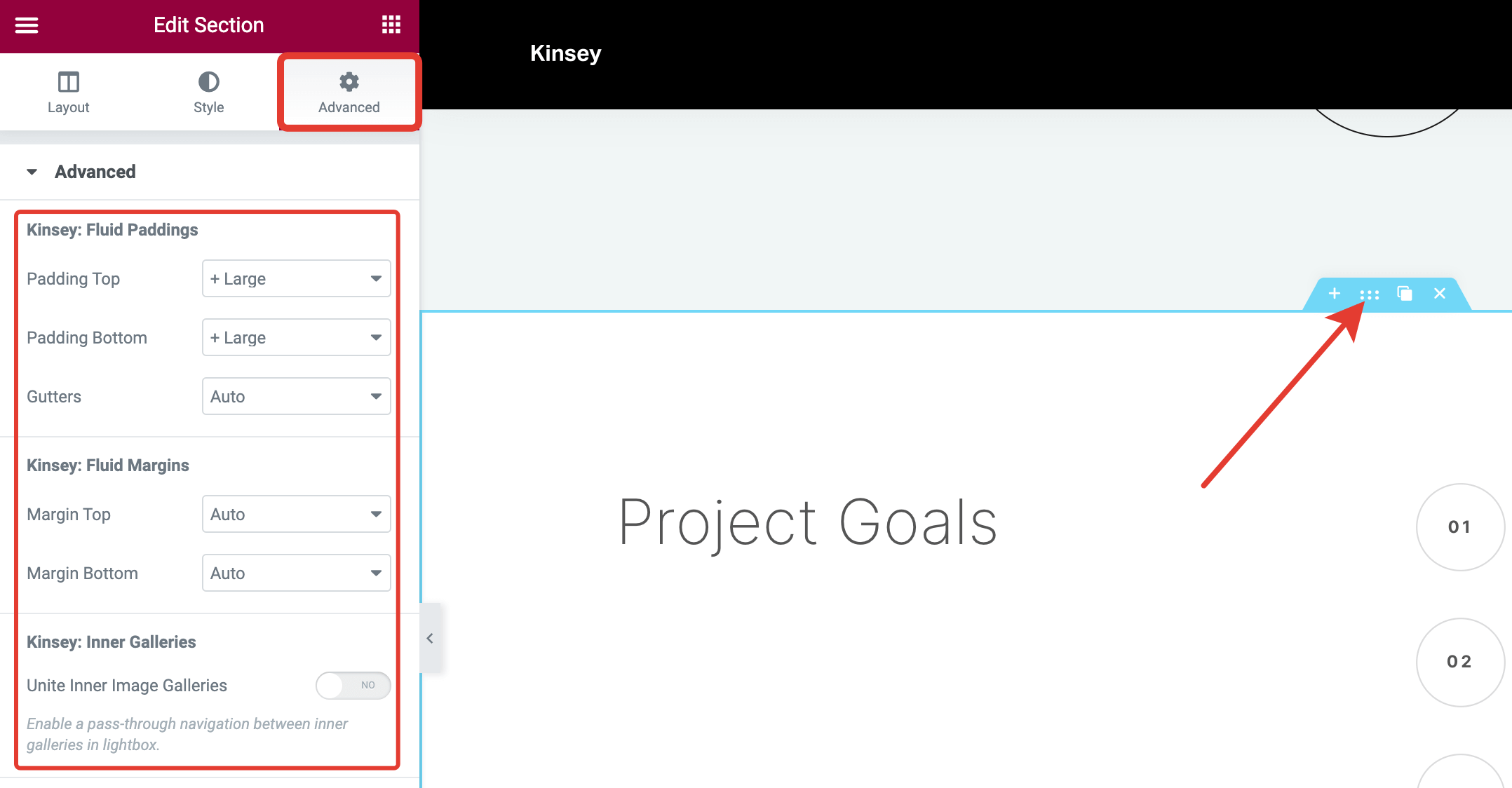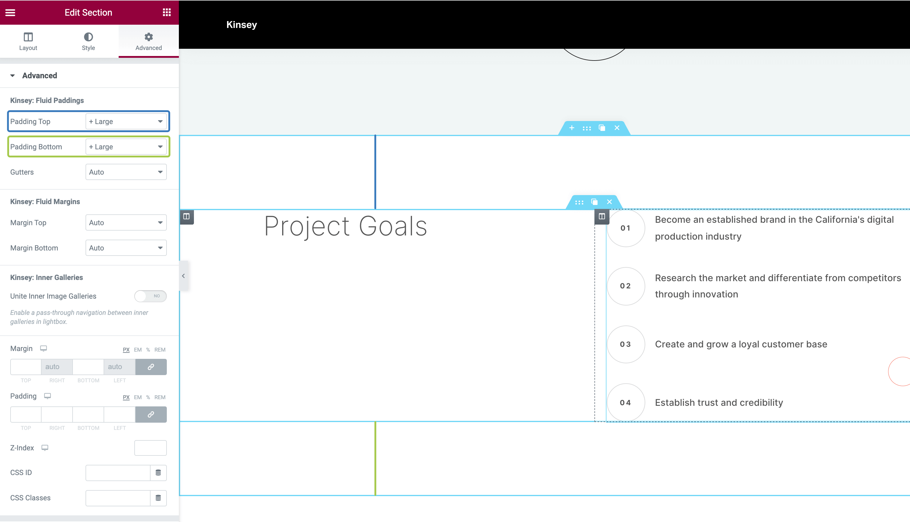 Kinsey theme supports a very handy extension that simplifies the web design process. It offers presets for paddings, margins, and color themes. These presets are available from the standard Elementor Section widget in the Style and Advanced tabs.