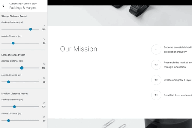 If you'd like to adjust these presets more precisely, you can do so from WordPress Customizer → General Style → Paddings & Margins. You need to define just two values per preset – the minimum spacing value that will be used for 320px mobile screens and the maximum spacing value that will be used for 1920px desktop screens and wider.