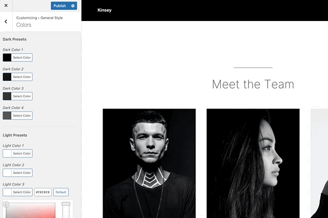 Of course, you don't have to stick with the default theme color palette. You can easily adapt theme colors according to your brand style guide from WordPress Customizer → General Style → Colors.