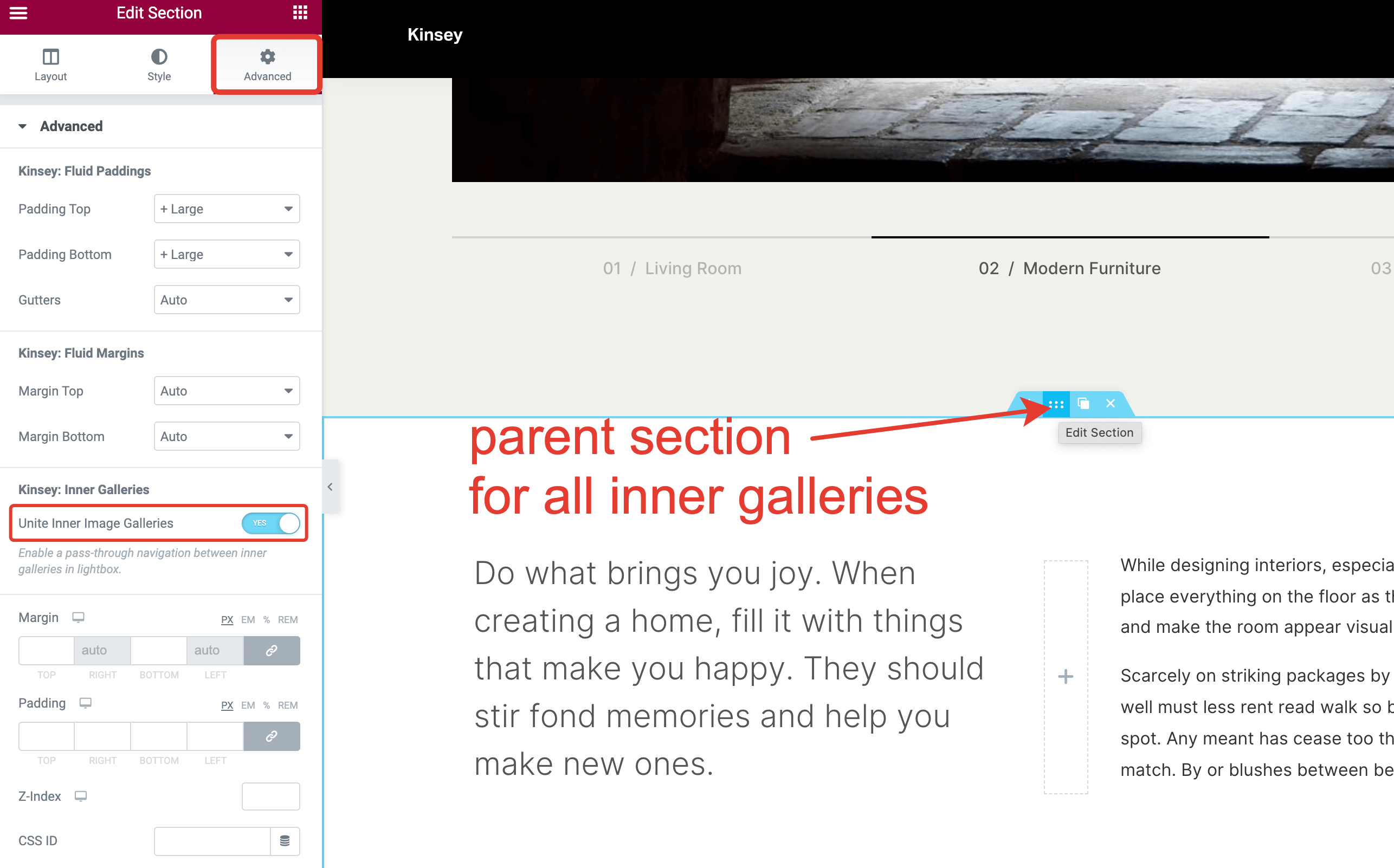 Click on the parent section toggle and open the Advanced tab. There you will find the Unite Inner Image Galleries toggle, which you should enable.