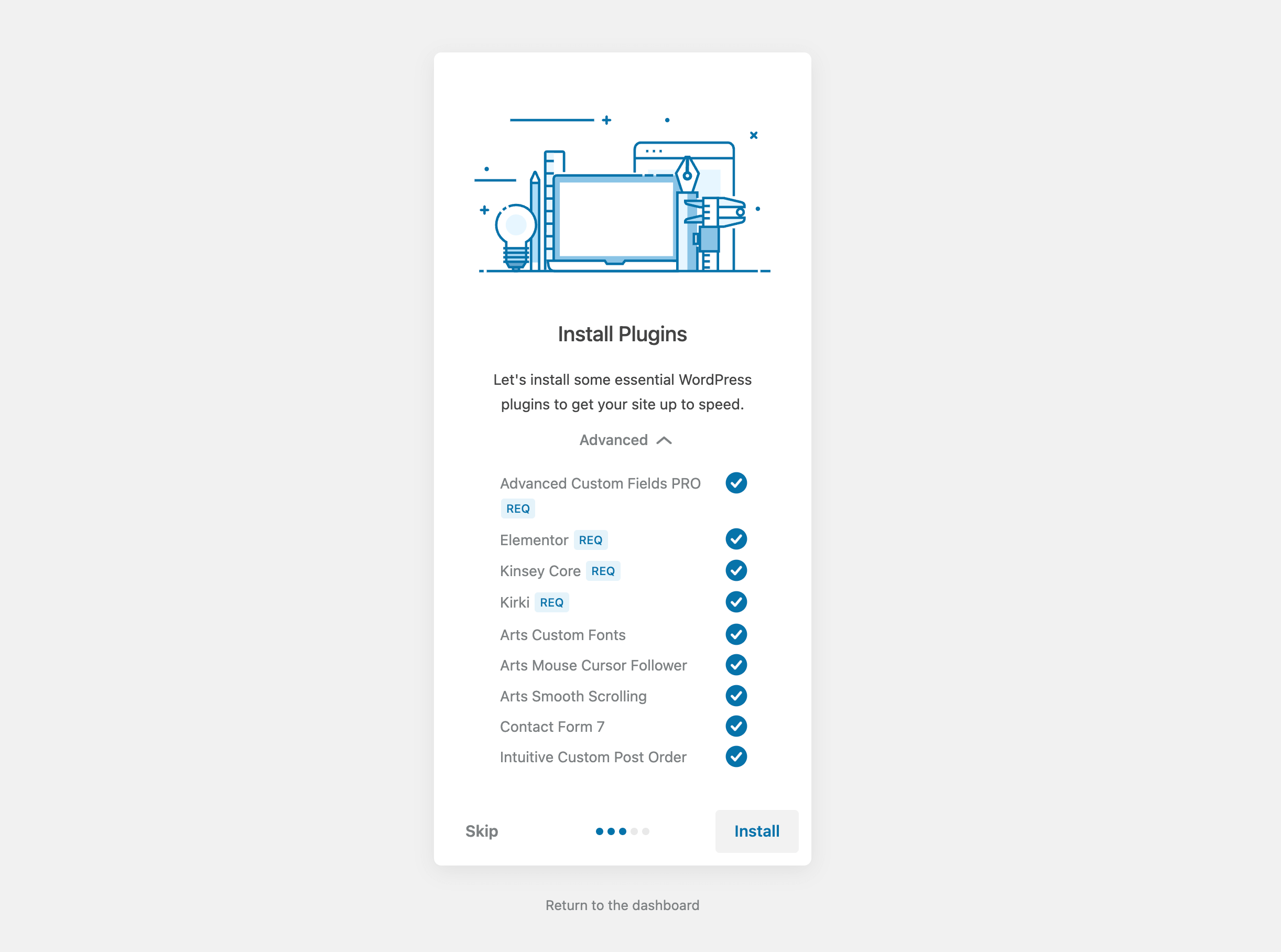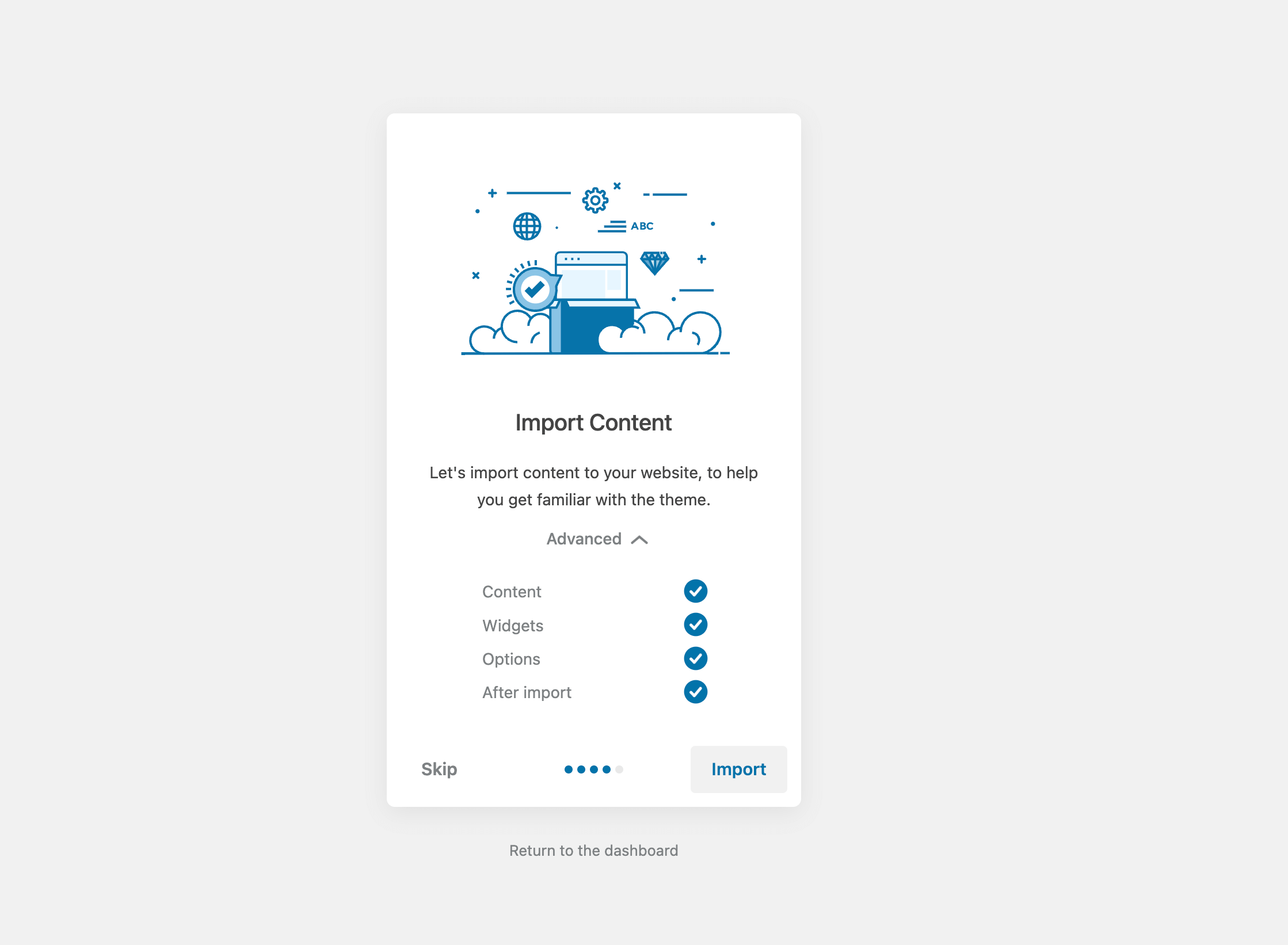 After the first theme activation, you should see a simple wizard that will help you with the initial theme setup. Simply follow all the steps by clicking the Next button. After completing all the steps, you will be ready to use your brand new website.