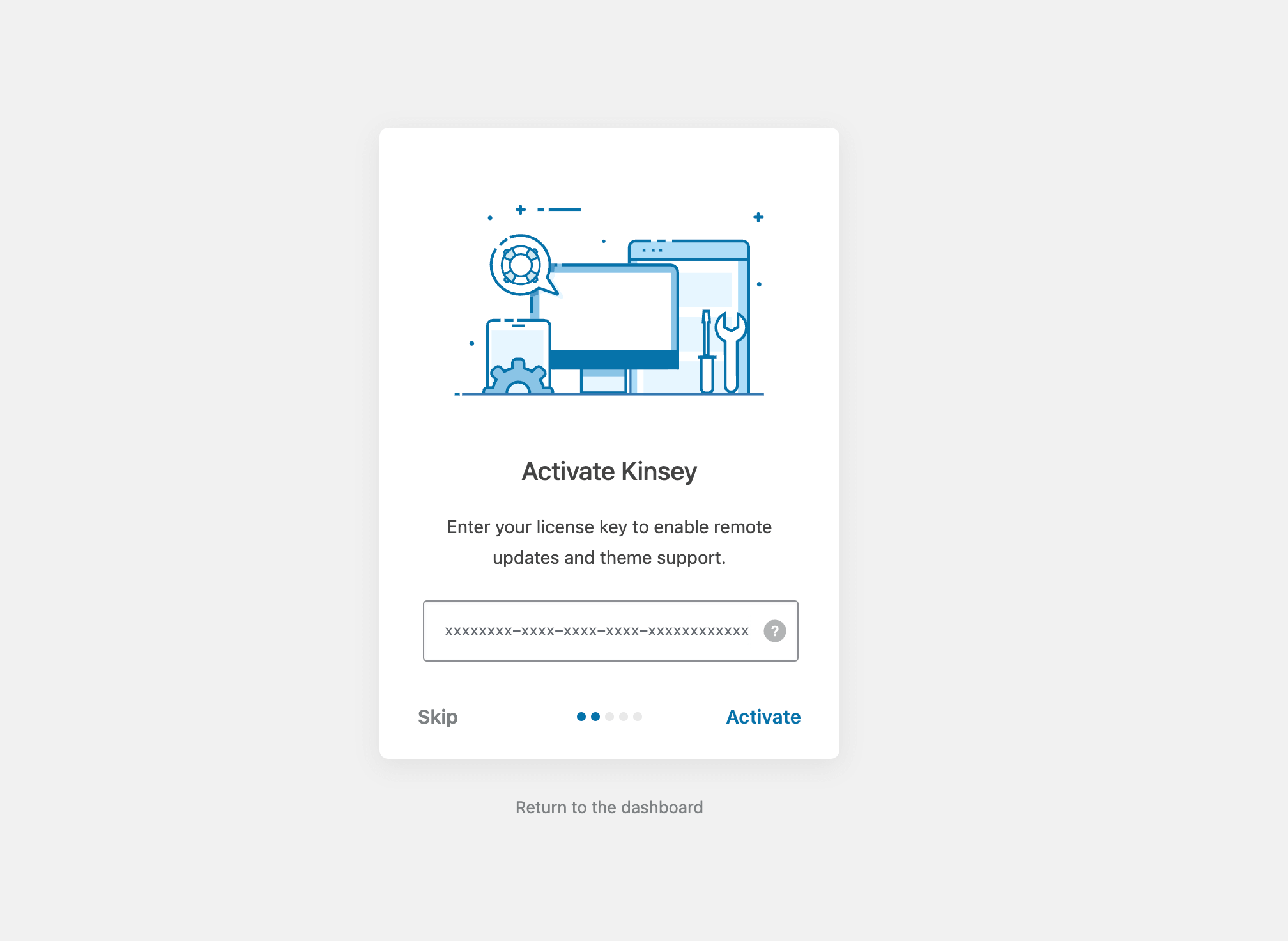 Activate your theme license by entering the purchase code. If you don't have a purchase code yet – e.g., you downloaded the theme via Envato Elements, please click the Skip button.