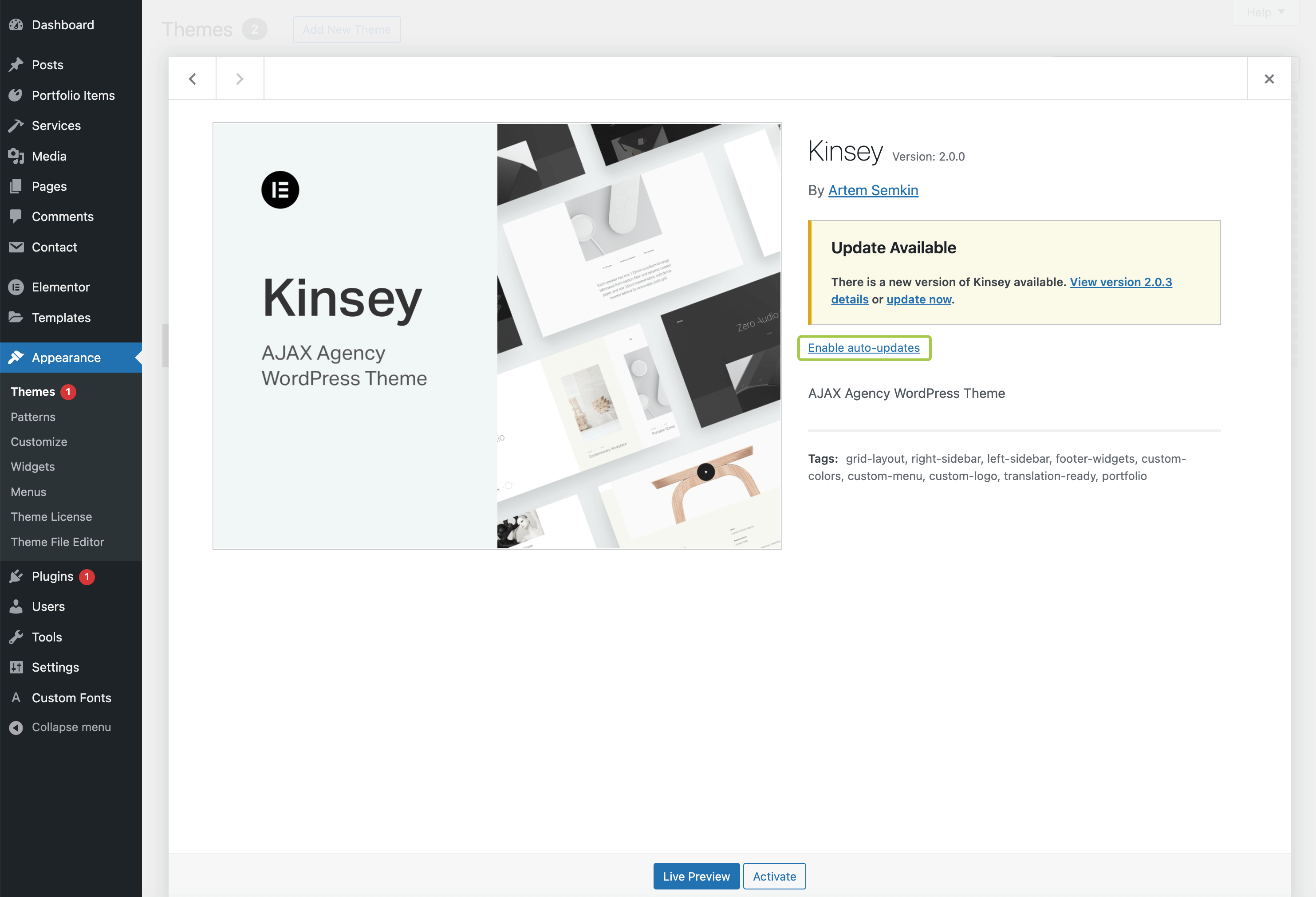 To ensure compatibility with the latest WordPress and plugins required by the theme, it's recommended to turn on automatic theme updates: