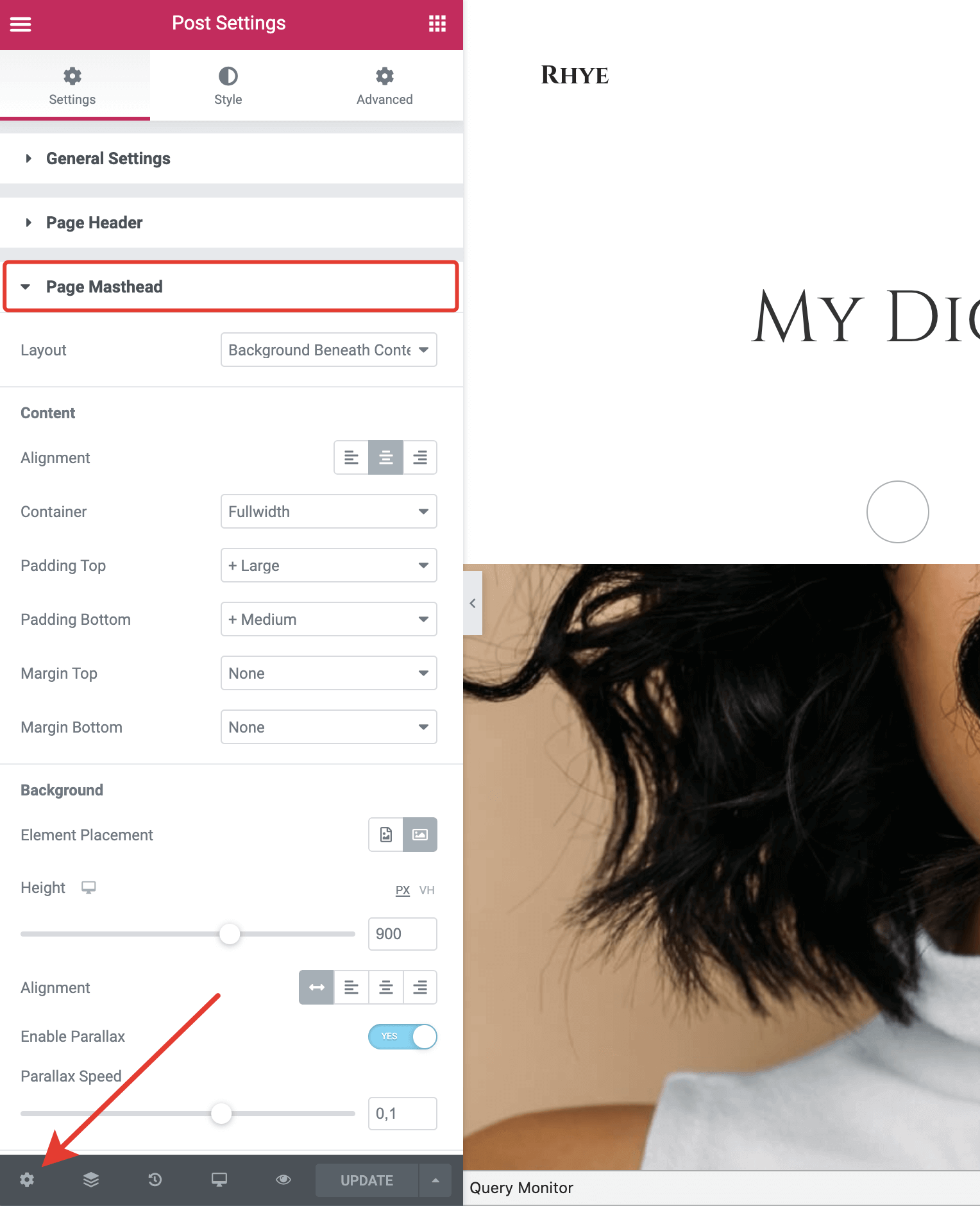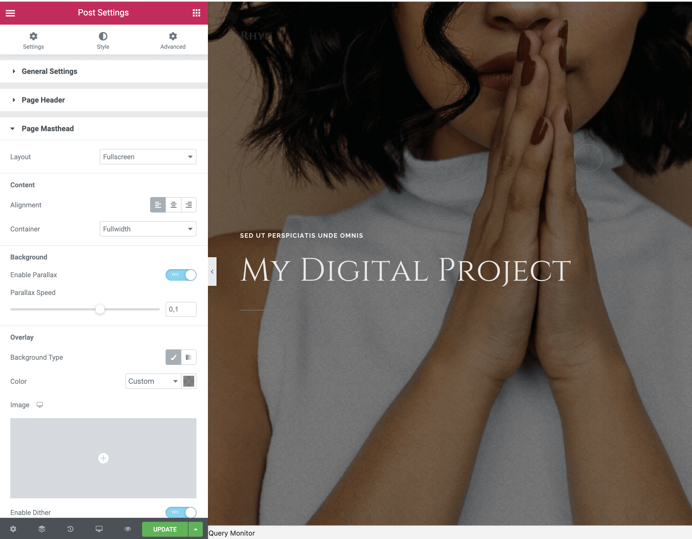 You will see that the new portfolio item is saved to the WordPress database and we are ready to fill it with content! But before that, let’s make some styling adjustments. While in Edit with Elementor mode, go to Document Settings → Page Masthead and make the necessary adjustments. You have plenty of options to play with here.
