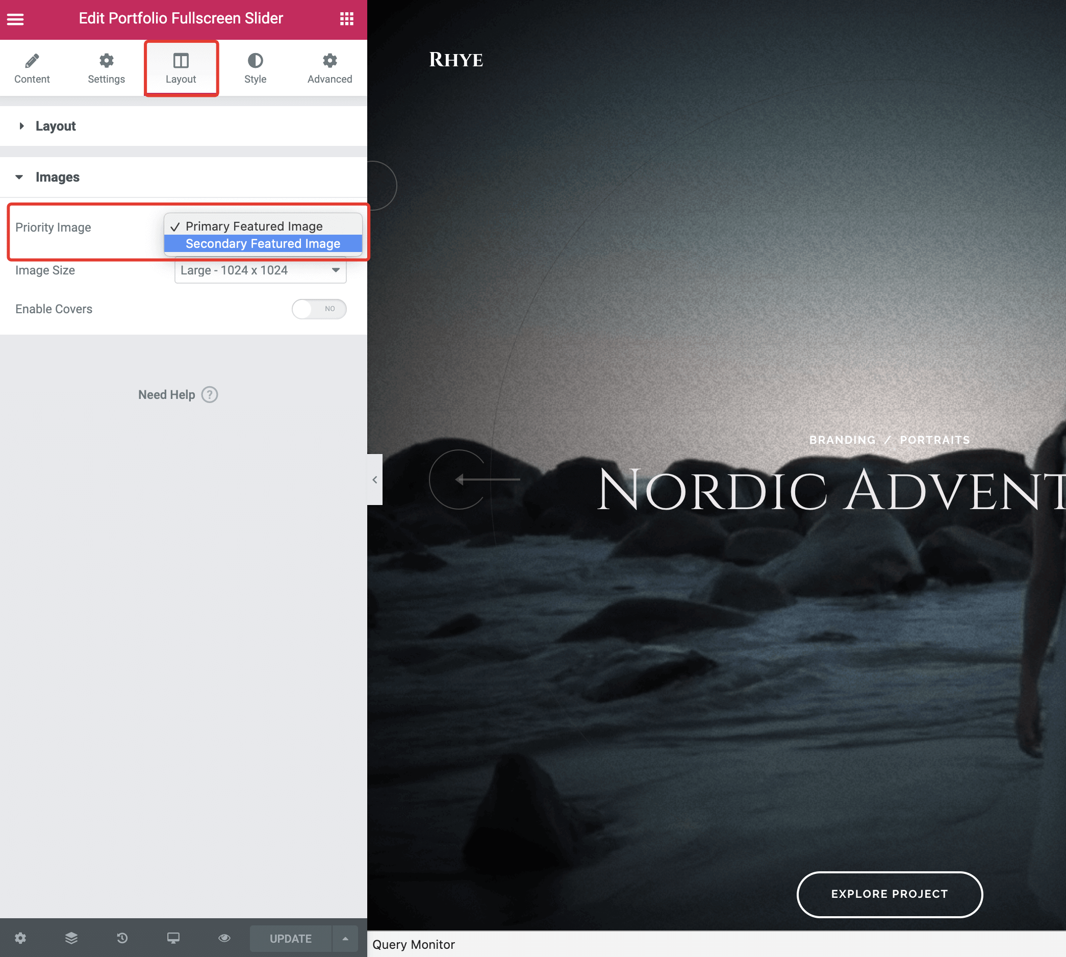 When you save a new portfolio item, it will be automatically fetched in dynamic Elementor widgets. For example, here is a fullscreen slider widget where our new portfolio item just appeared.