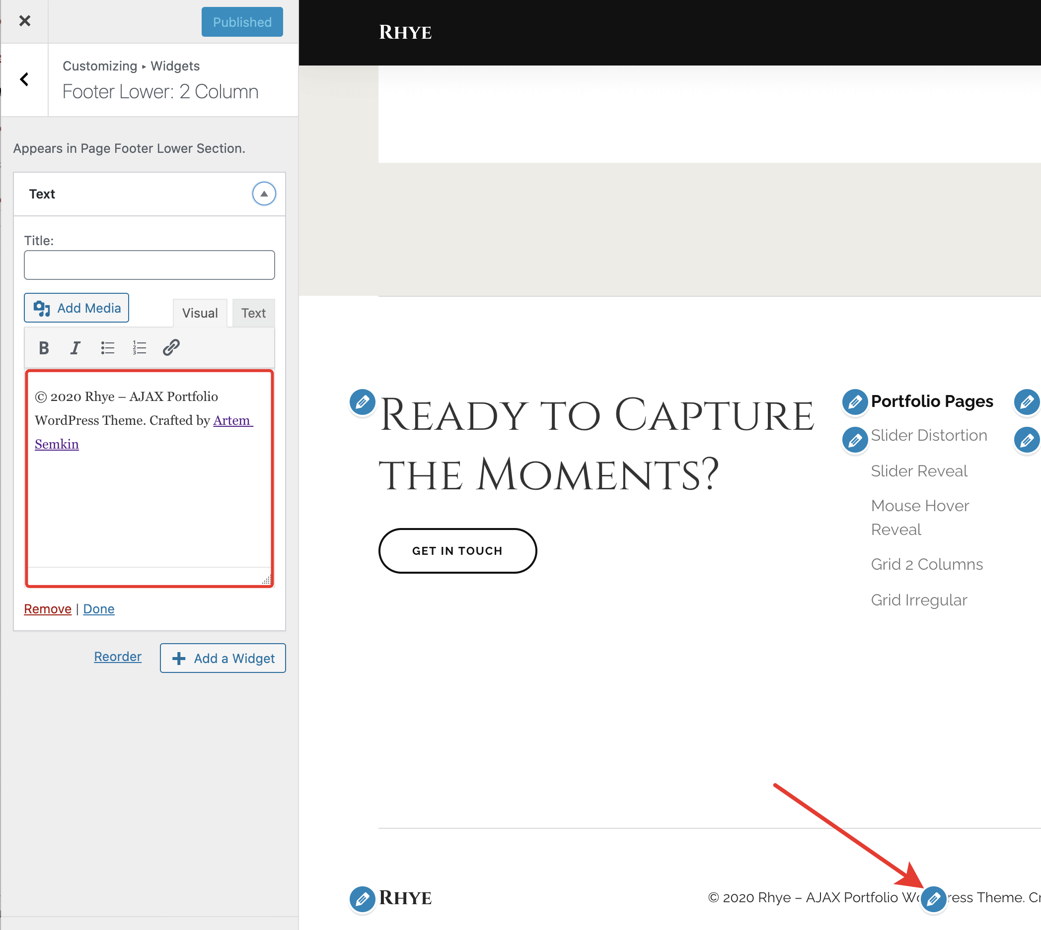 The footer is a widgetized area in the Rhye theme. For example, to edit copyright information or social media links, you need to edit your widgets. But before doing that, let's see how to adjust the footer layout first.