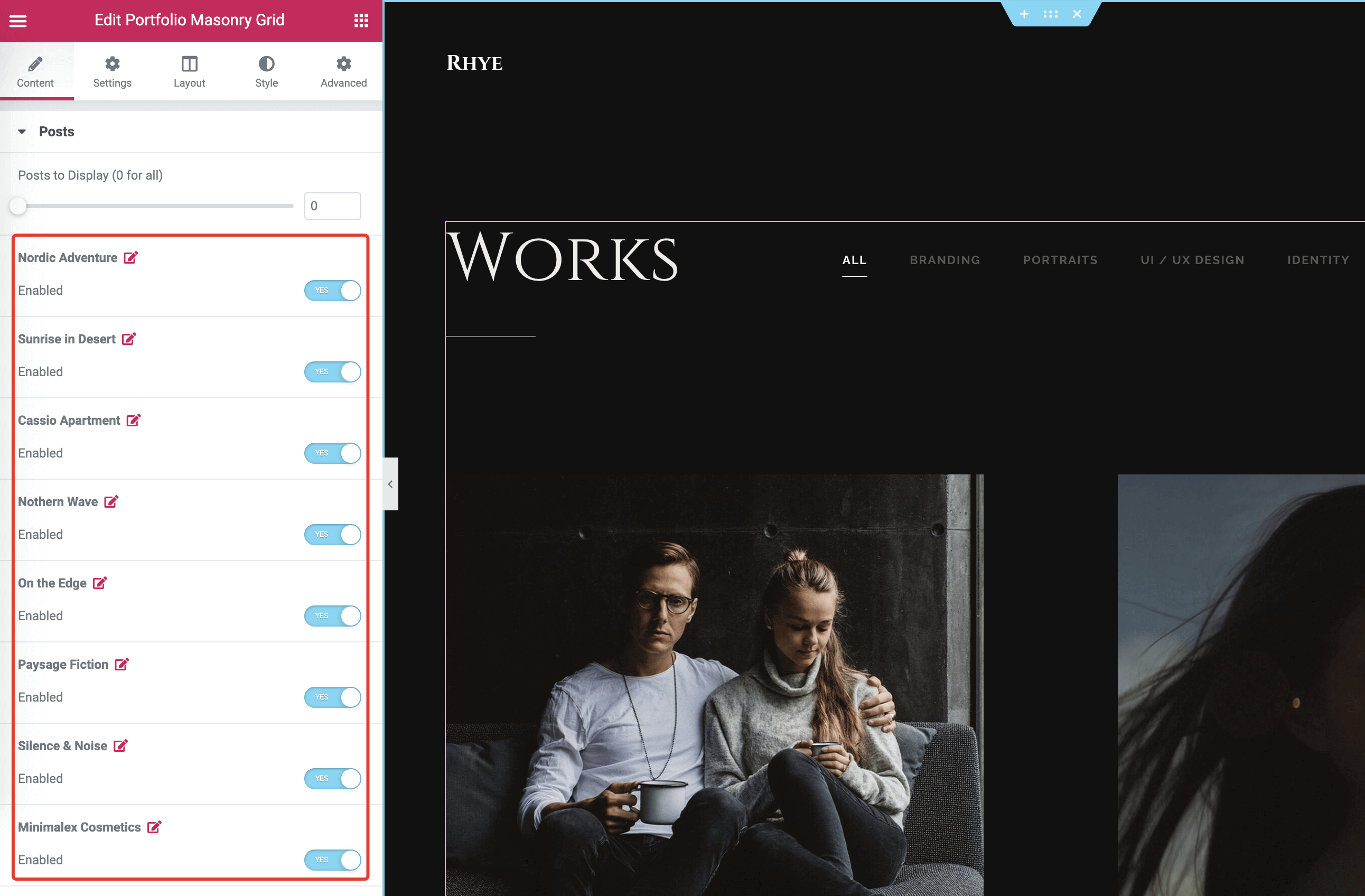 Consider the next example. The Portfolio Masonry Grid widget pulls content dynamically from the theme's Portfolio Item custom post type. Editing options are far more limited; for example, you can’t edit the portfolio headings from here.