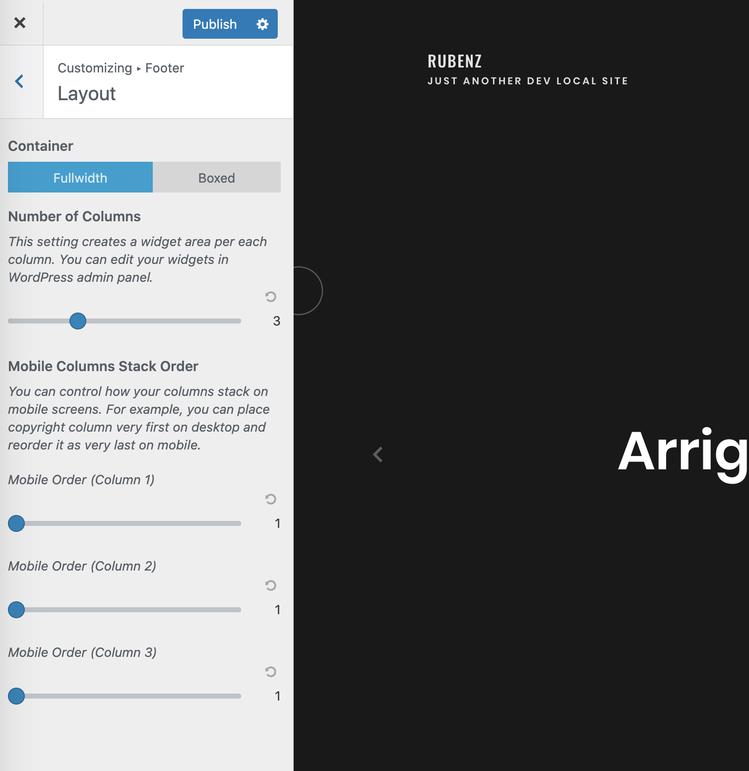 The footer is a widgetized area in the Rubenz theme. For example, to edit copyright info or social media links, you need to edit your widgets. But before doing that, let's see how to adjust the footer layout first.