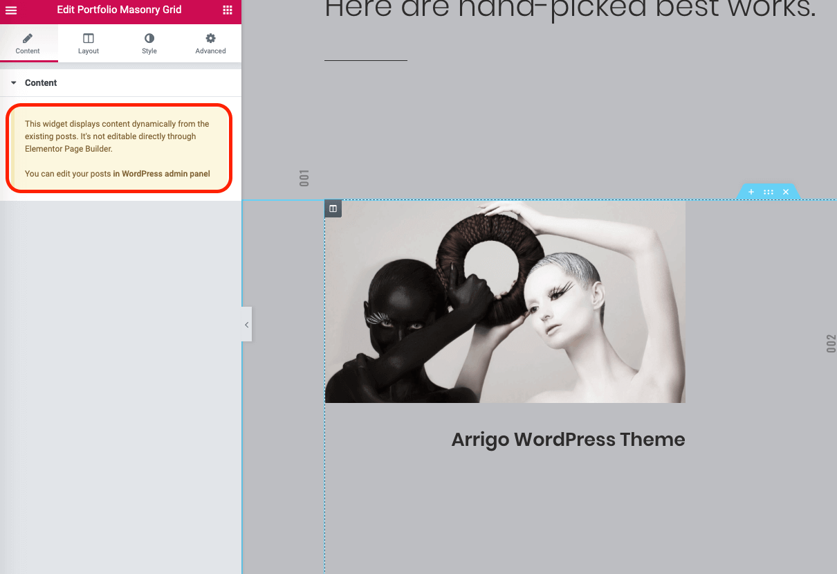 Consider the following example: the Portfolio Masonry Grid widget pulls content dynamically from the theme's Portfolio Item custom post type. Editing options are limited; for example, you can’t edit the portfolio headings from here.