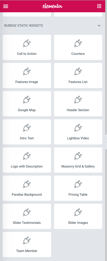 Rubenz comes with custom, carefully crafted widgets that you can easily use during page building. If you scroll down the widgets panel, you will see Rubenz widgets sections. But before using them, let me explain what Static and Dynamic widgets are.
