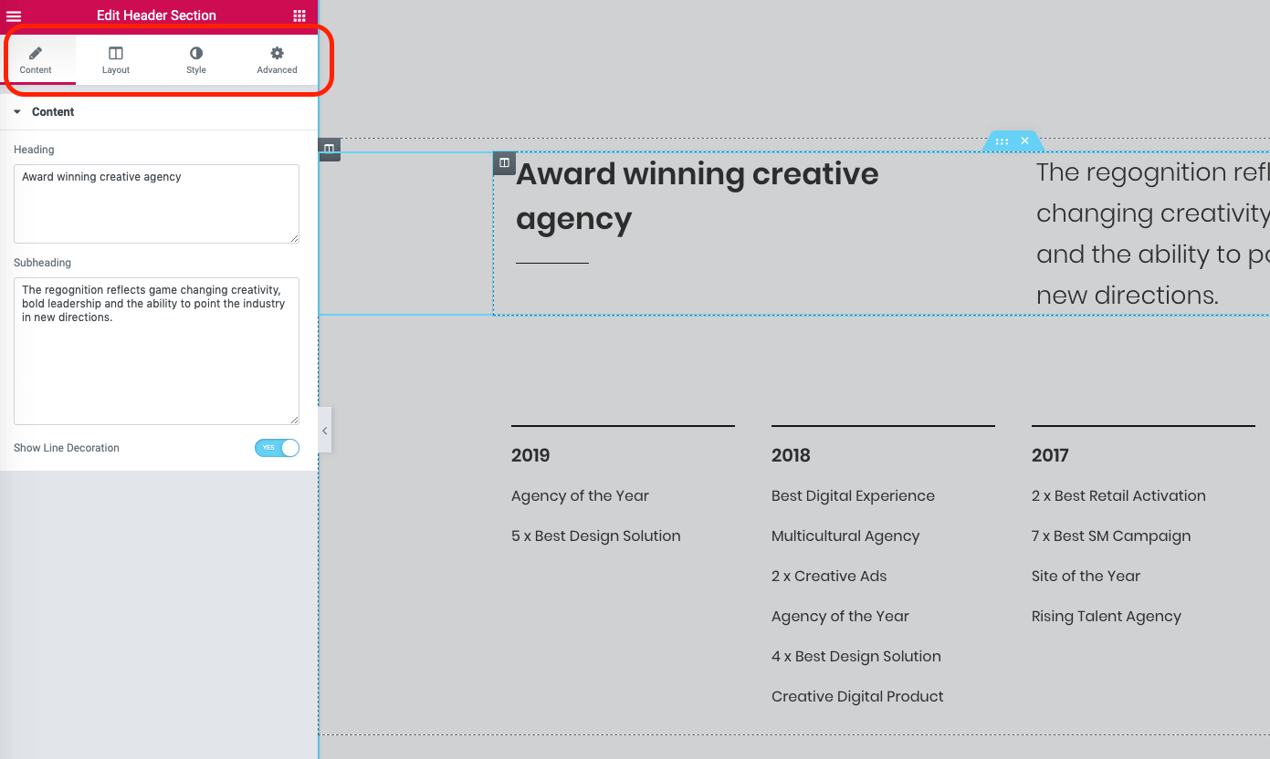 Each Elementor widget has certain options you can adjust. These options vary per widget and are available in the left panel. Options are grouped into five tabs: Style, Layout, Settings, Content, and Advanced. The Advanced tab is intended for experienced users.