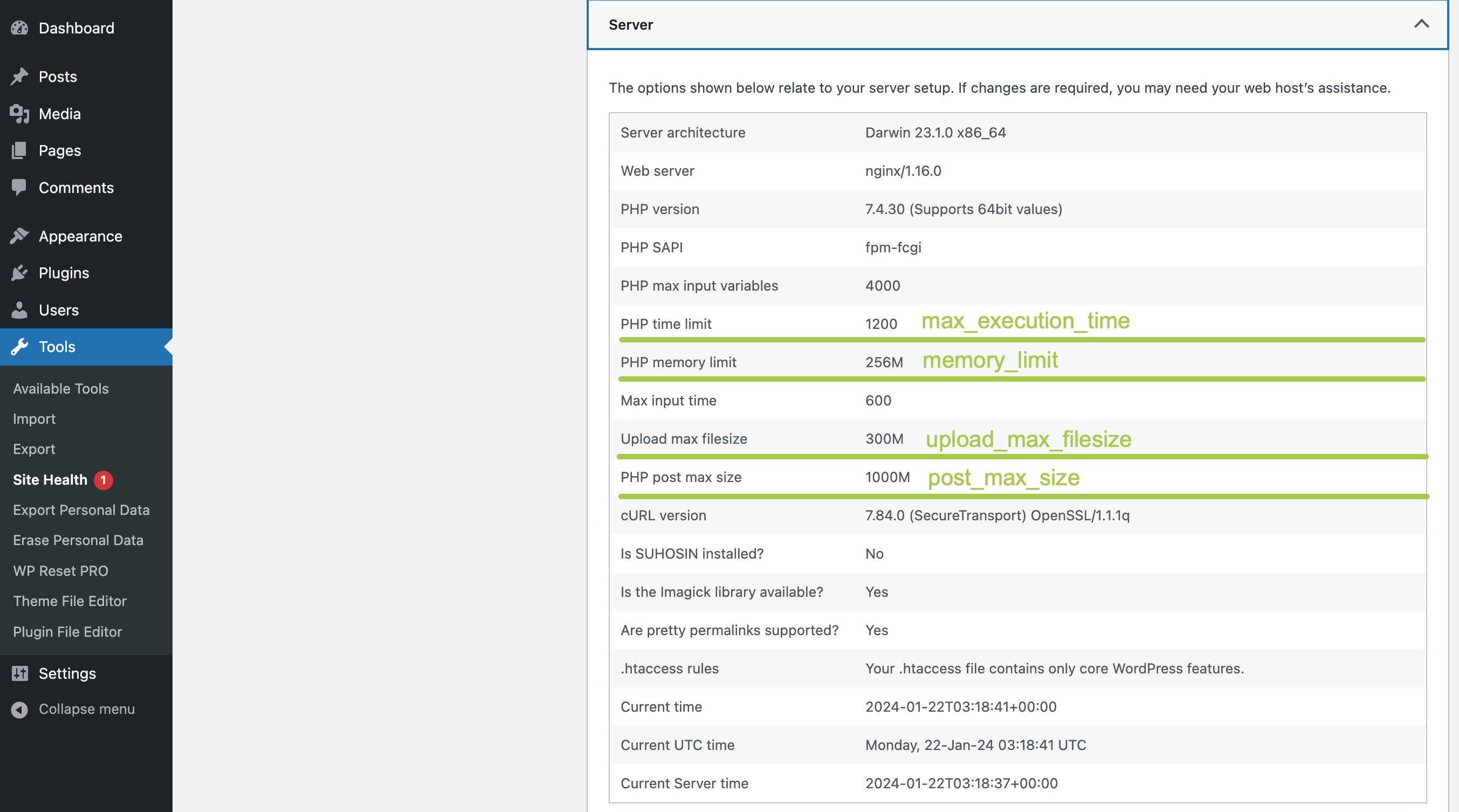 Double-check all the key numbers as underlined in the screenshot above. If your server has low configuration limits, please contact your hosting provider and ask them to increase those. More information related to recommended PHP limits can be found in the Server Requirements.