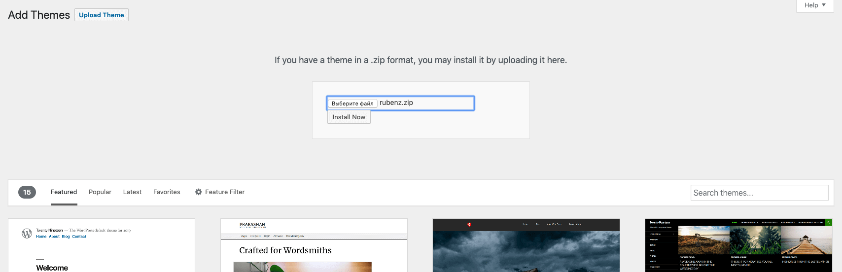 Select your downloaded theme file 📄rubenz.zip and click Install now.