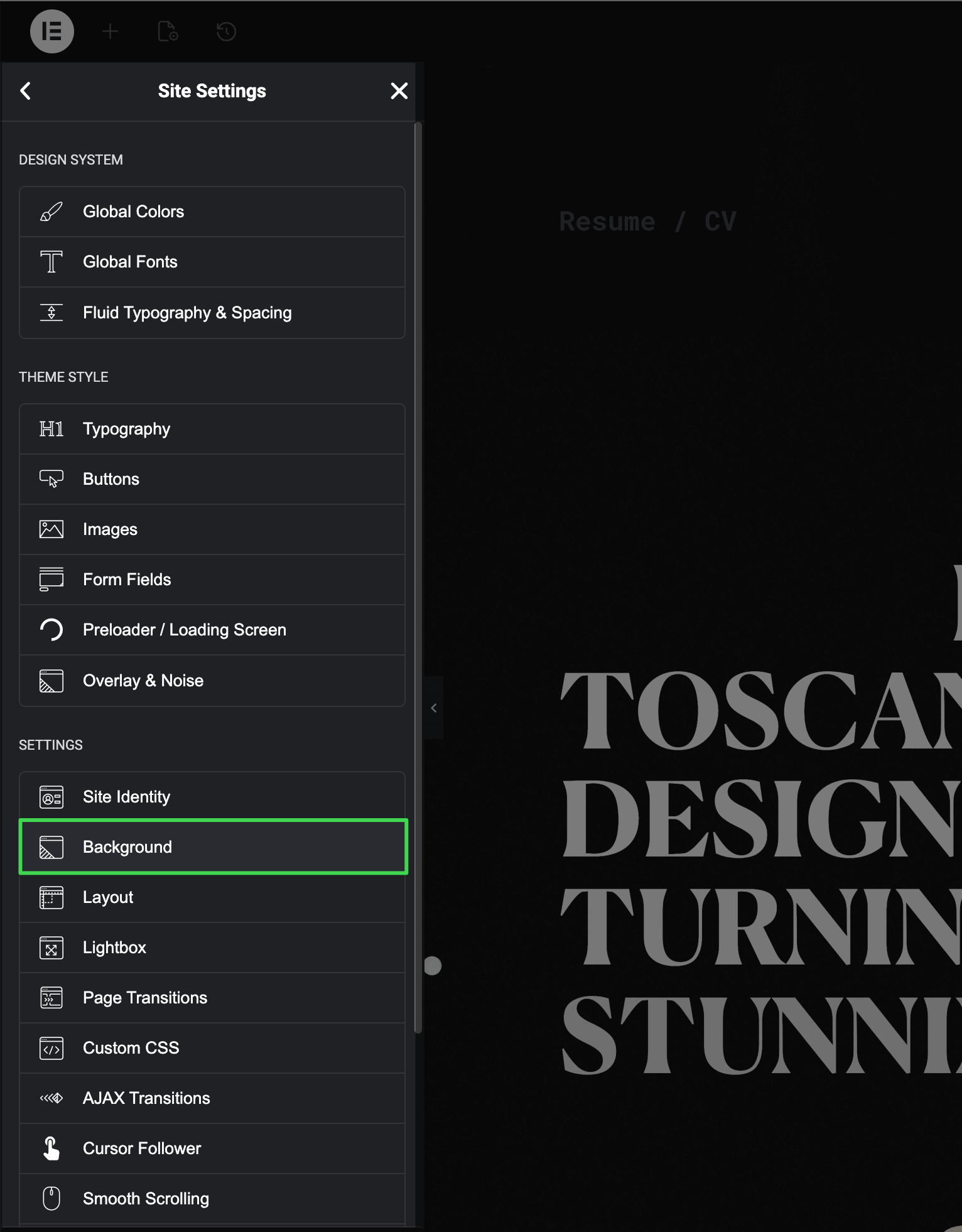 Open Site Settings panel in Elementor using this guide Accessing Theme Options Panel and select Background.