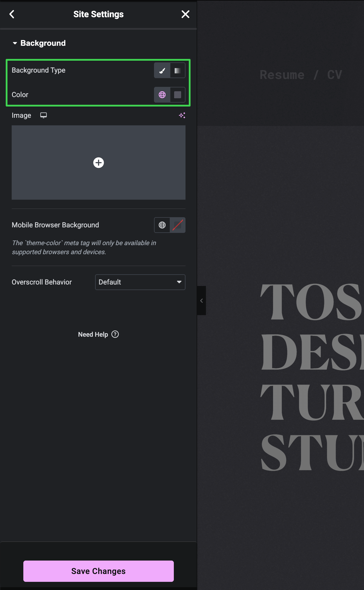 Set your desired background type, color, or image. This applies to all pages site-wide.