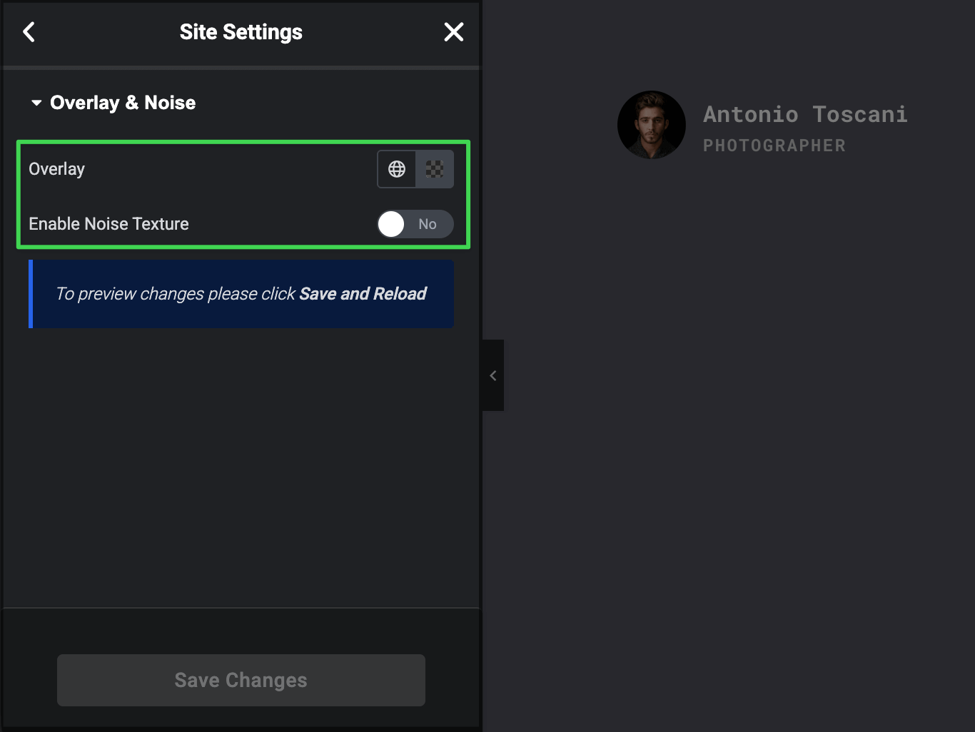 In Site Settings, navigate to Overlay & Noise.