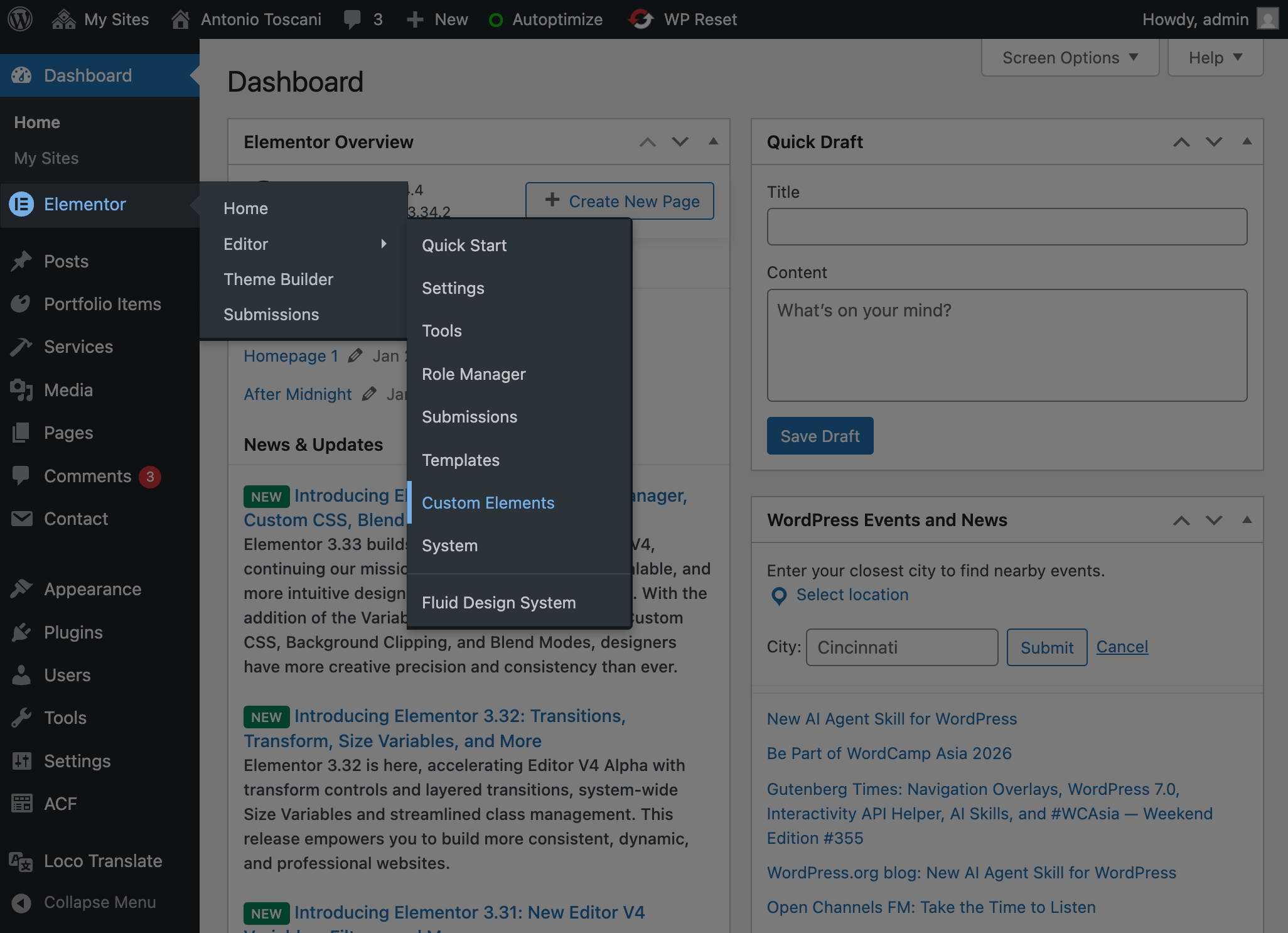 In the WordPress admin, hover over Elementor and select Custom Elements from the menu.