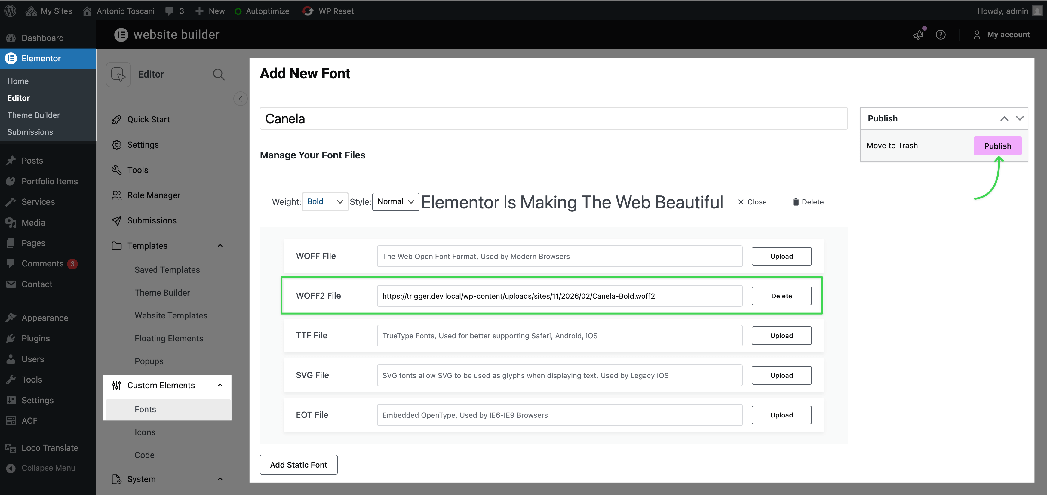 Name your font, upload your font files (.woff2 recommended), and click Publish. Add multiple variations for different weights if needed.