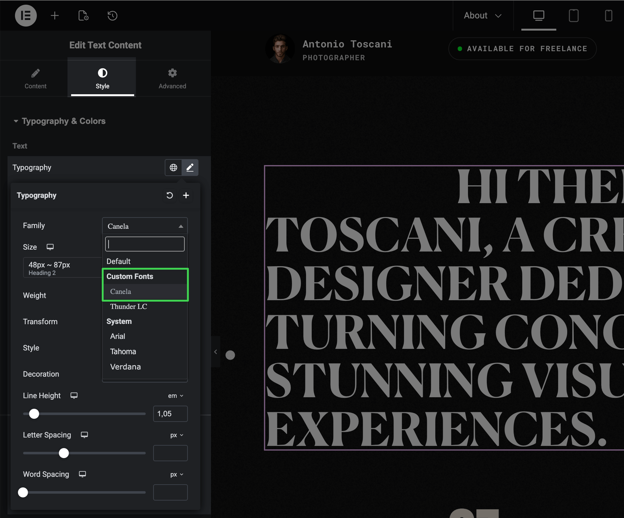 Your uploaded font now appears in the font family dropdown under Custom Fonts when editing any text element in Elementor.