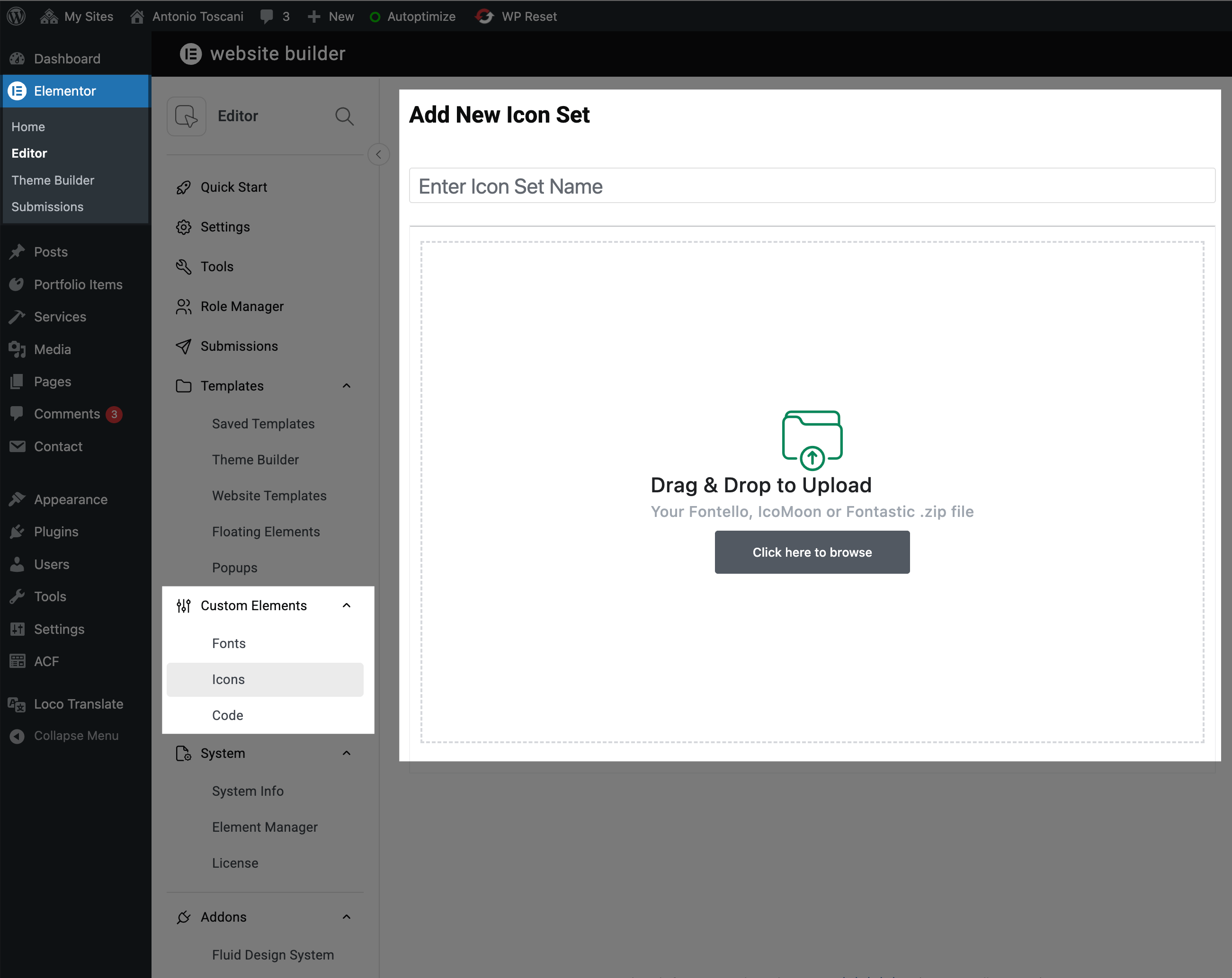 Go to Elementor → Custom Elements → Icons in WordPress admin. Upload your icon font package by dragging and dropping or clicking to browse.