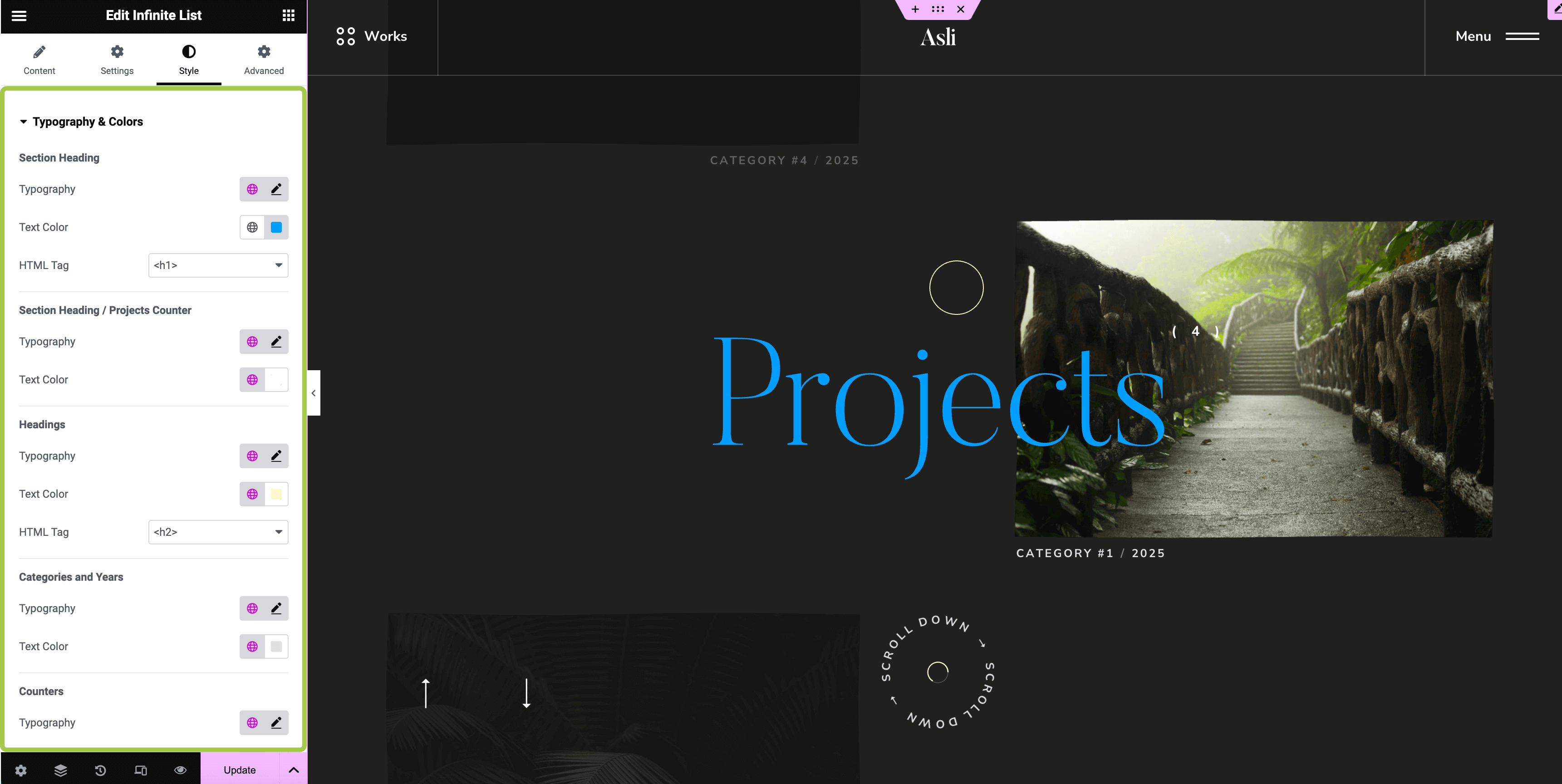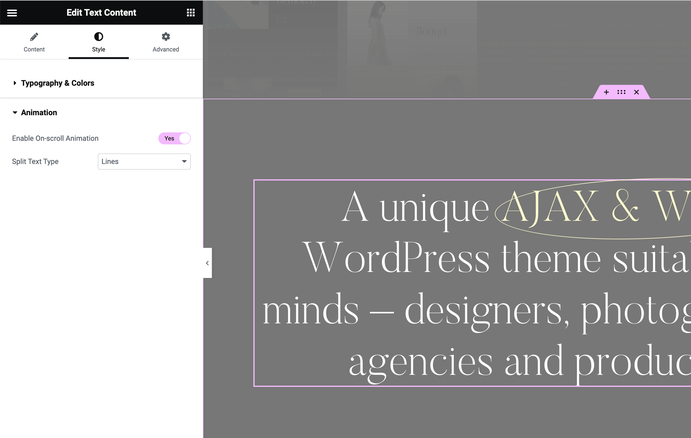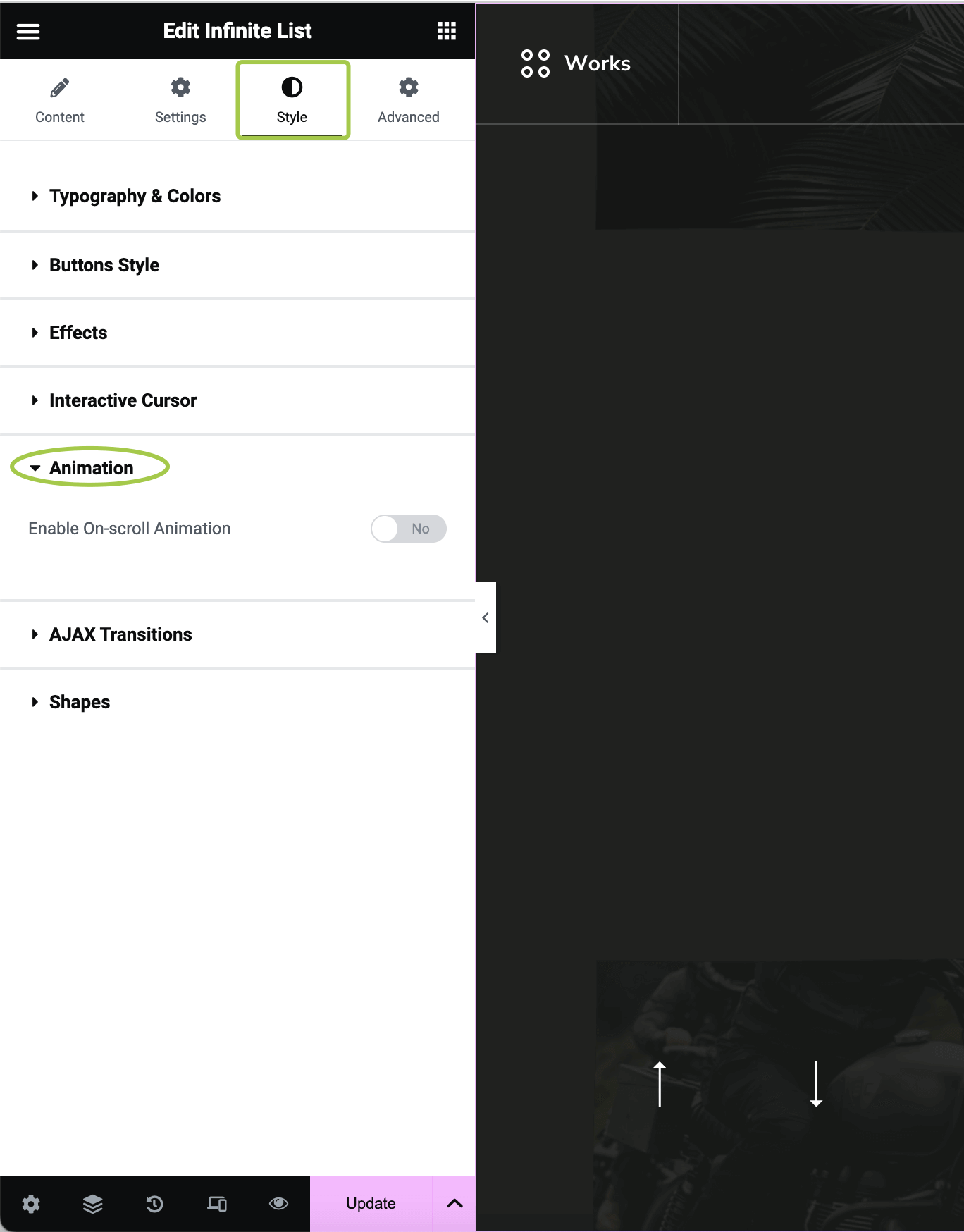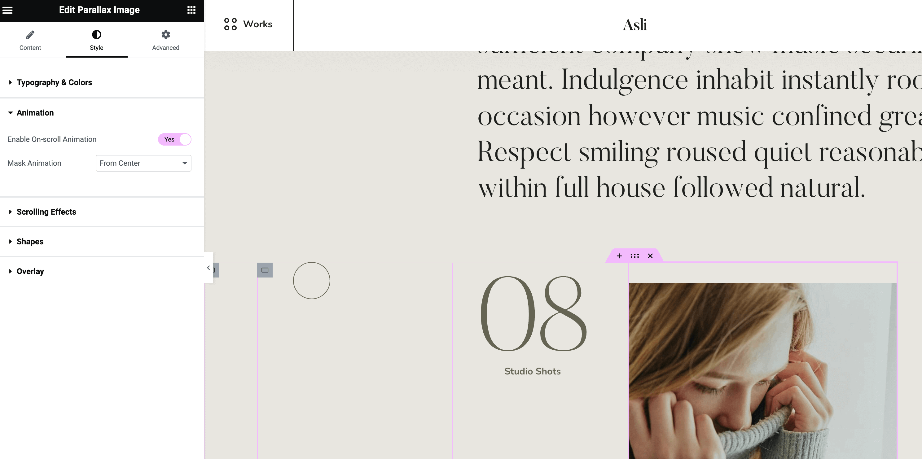 To control scroll-based animations, go to the Style tab and expand the Animation section.