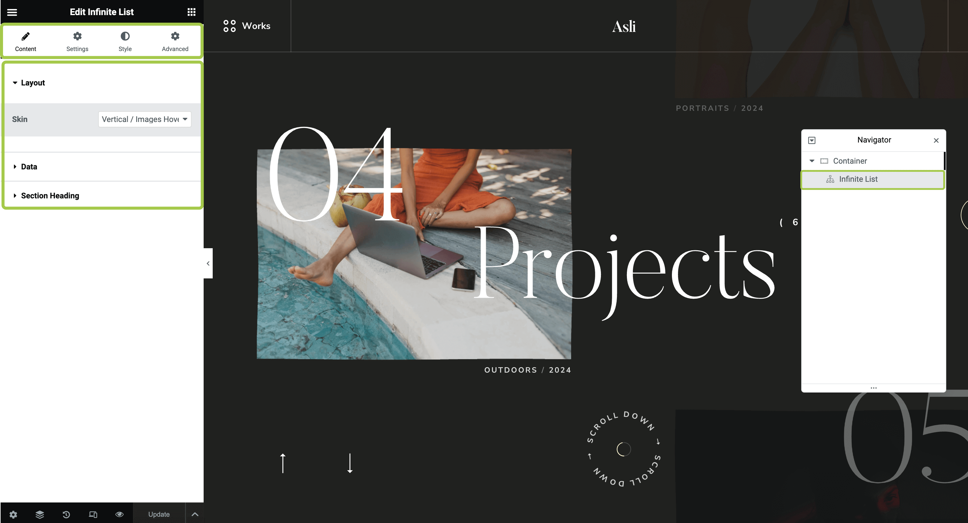 You will see a set of tabs in the left sidebar: Content, Settings, Style, and Advanced (these tabs may vary depending on the widget).