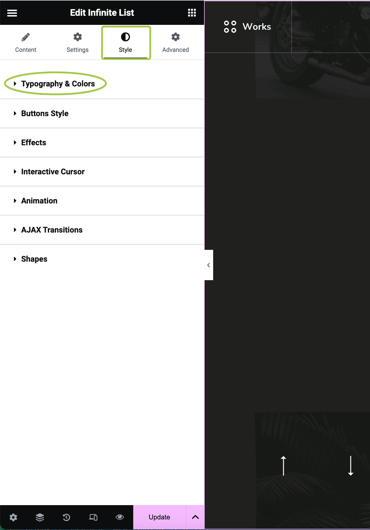 At the bottom left corner of the page, click Update to save your changes and preview them on the frontend.