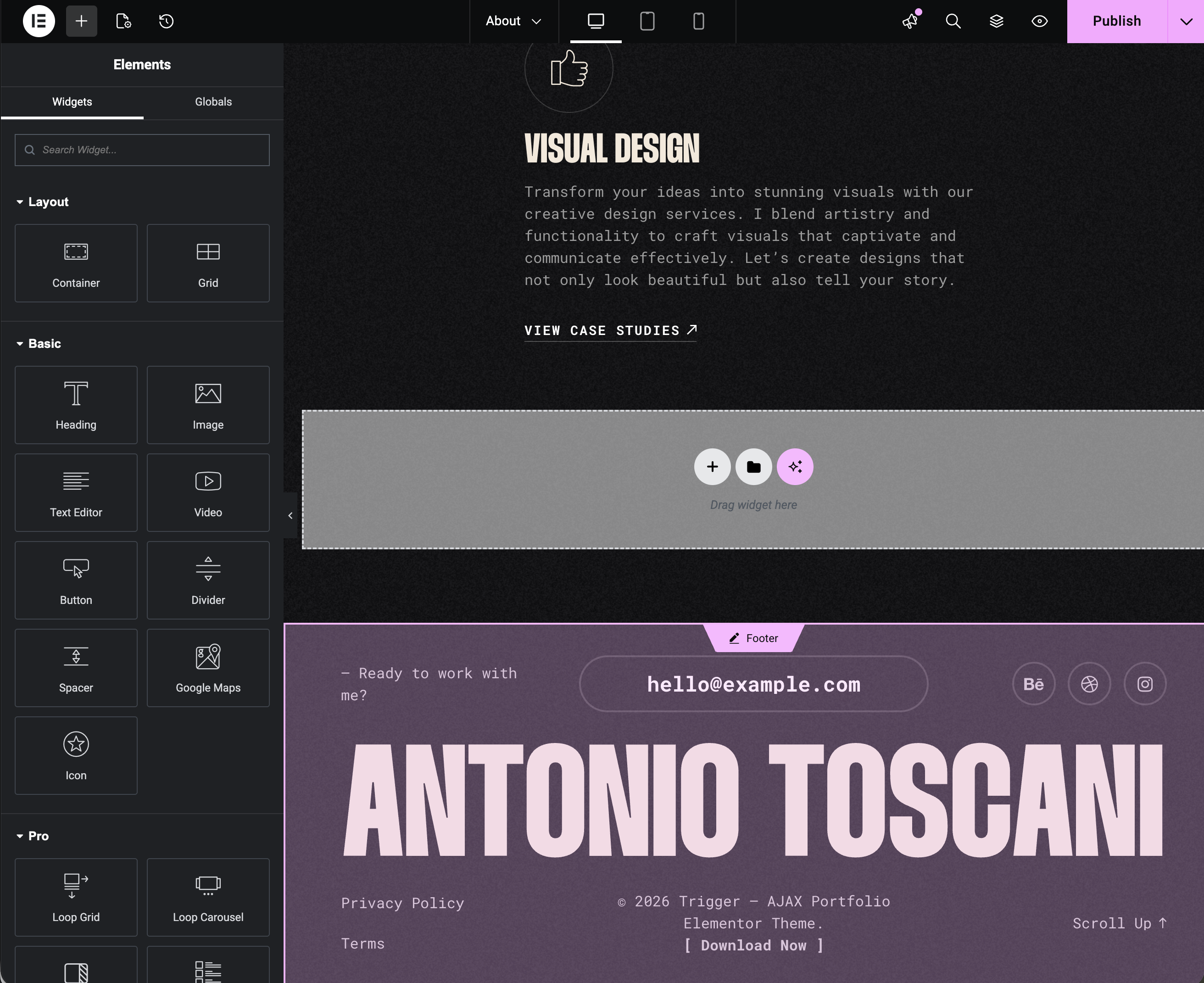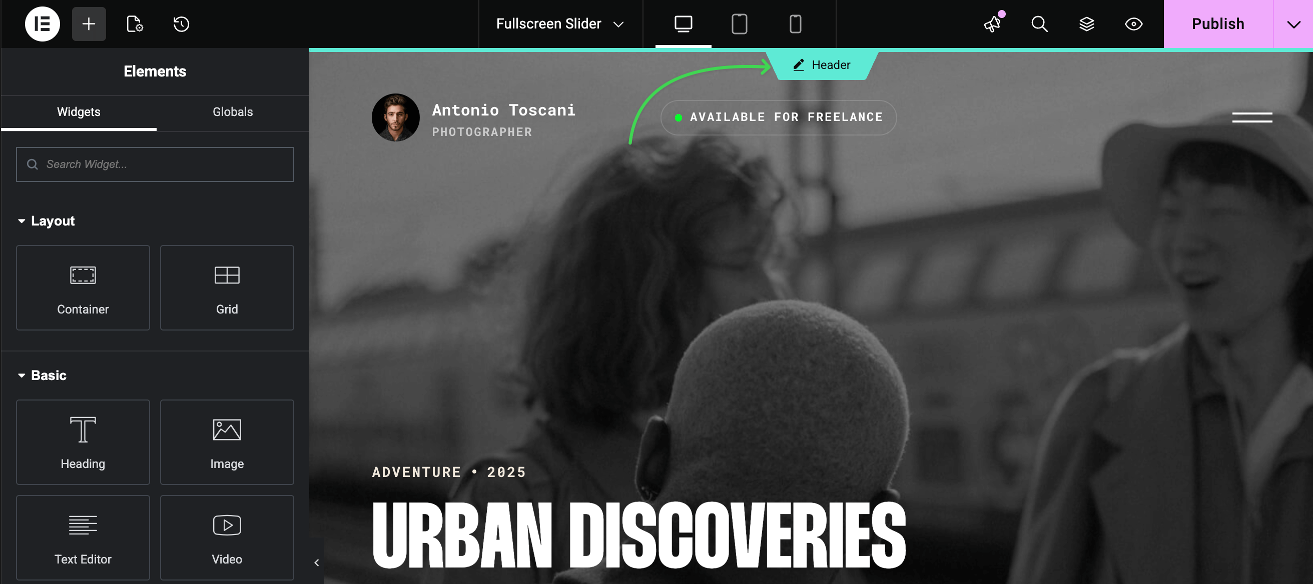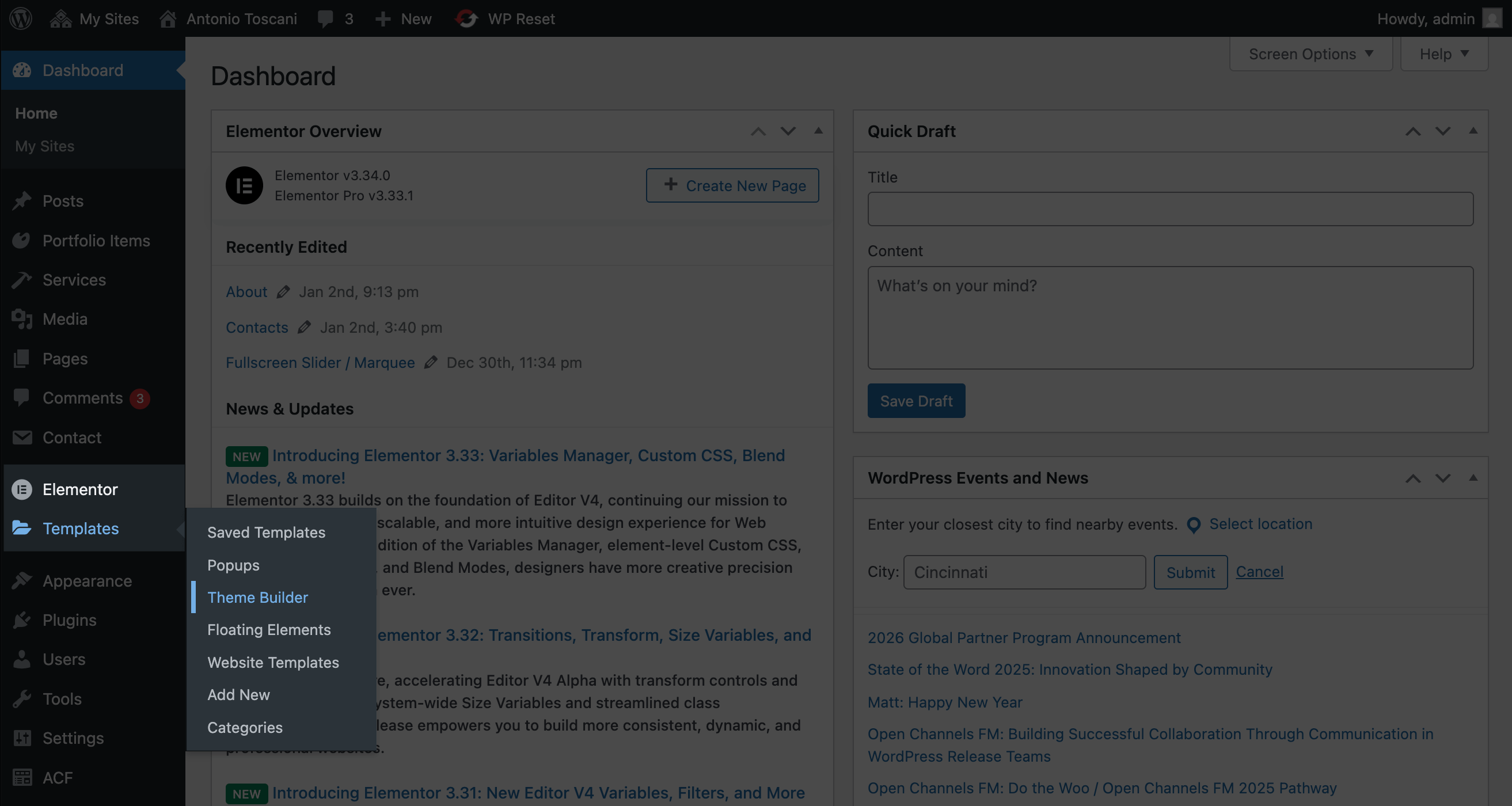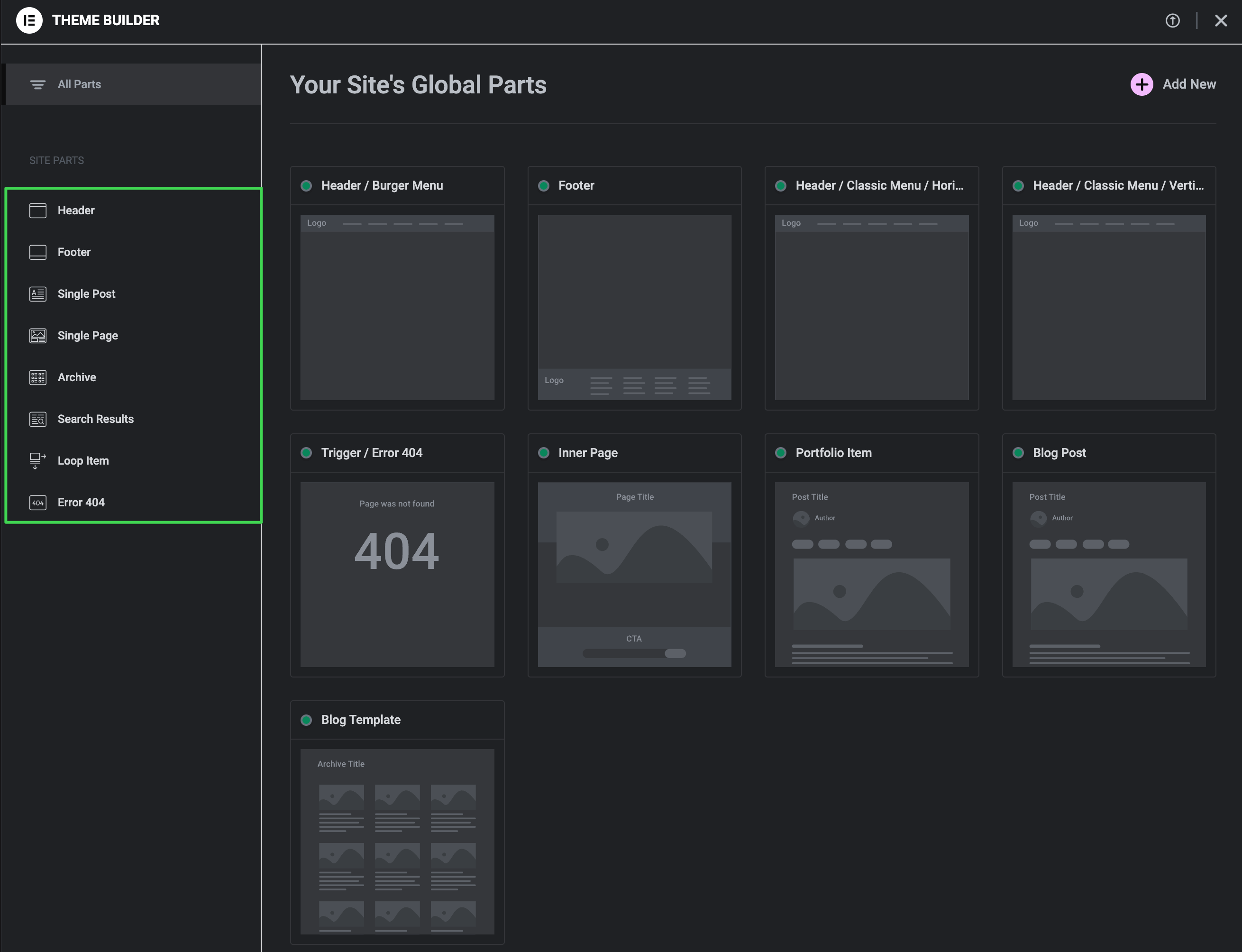 The Theme Builder is where you customize your site's global elements — the header, footer, blog post layouts, archive pages, and other templates that appear across multiple pages. Instead of editing these on every single page, you edit them once and changes apply site-wide.