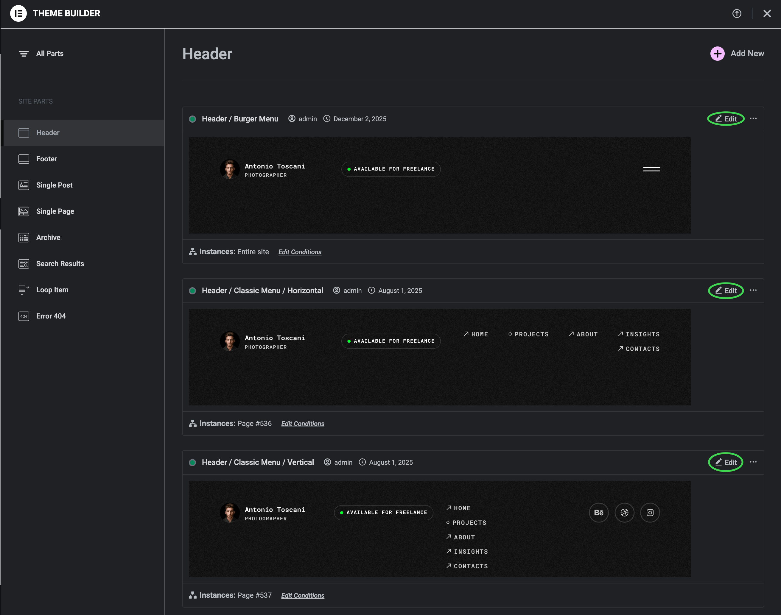 In the left sidebar, select what you want to edit: Header, Footer, Single Post, Archive, etc.