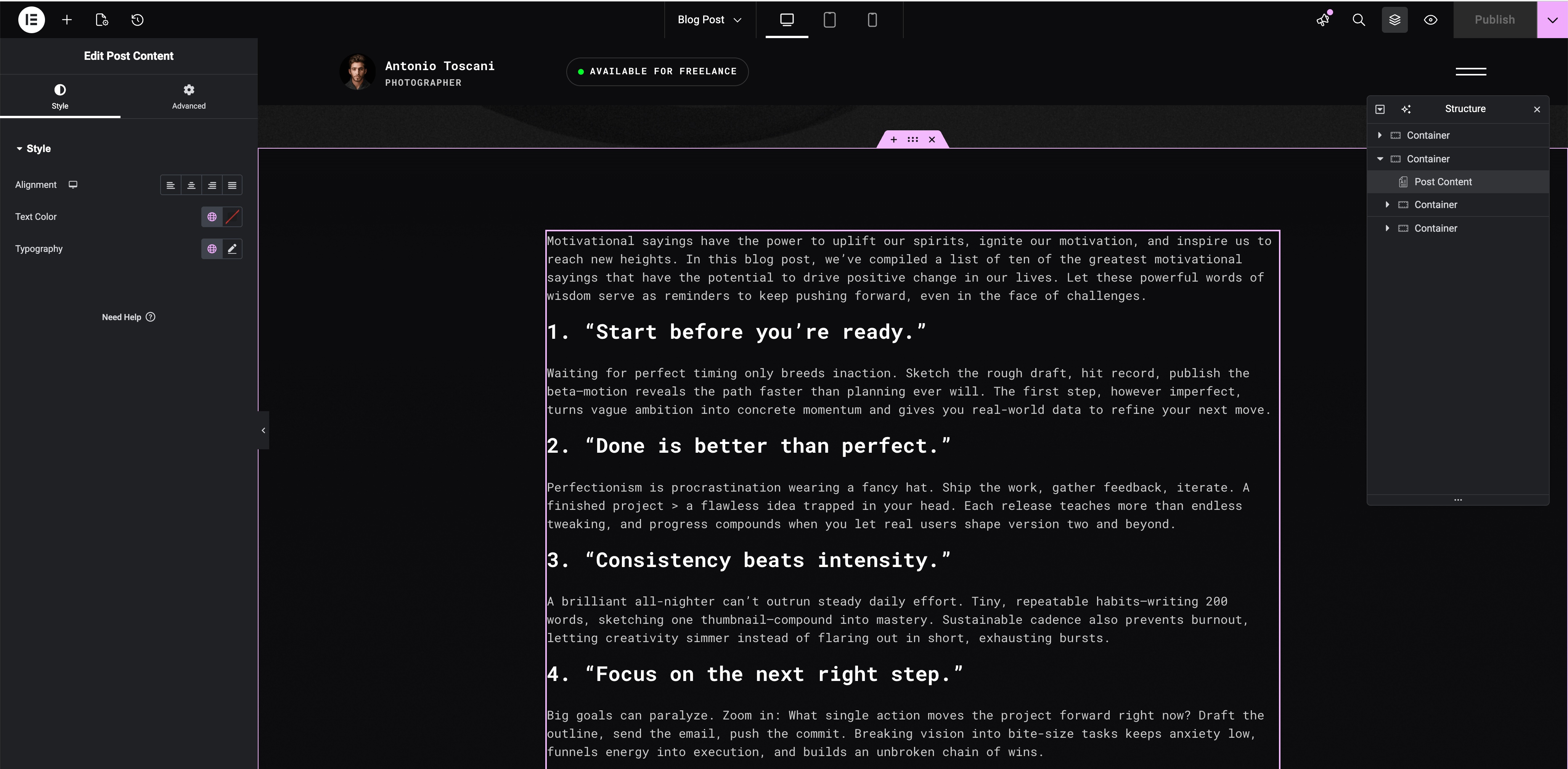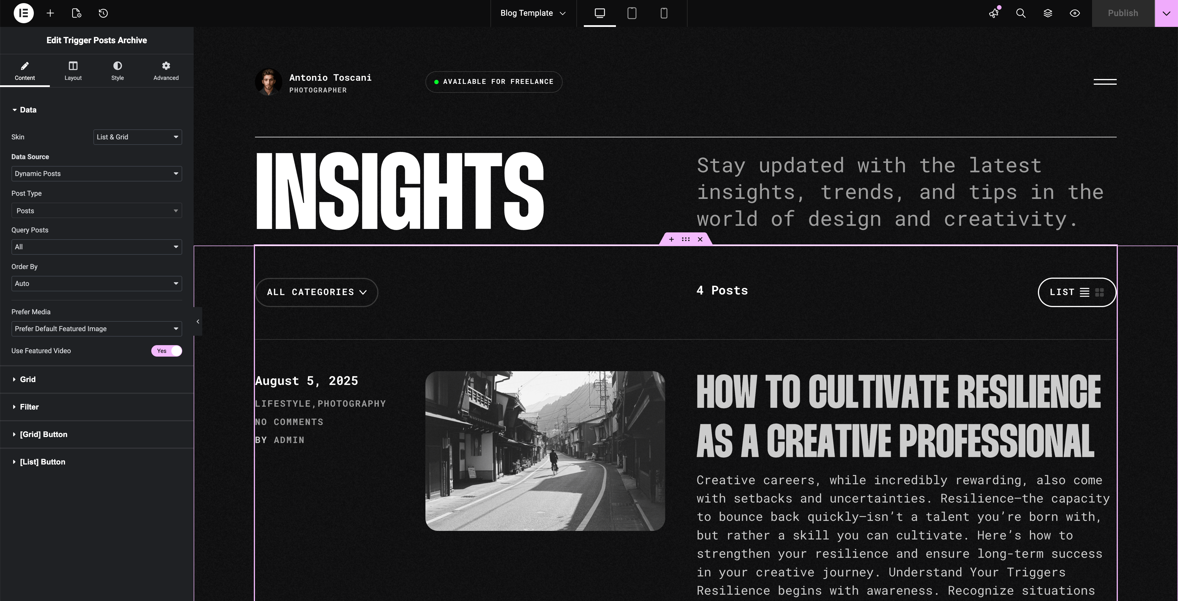 The Single Post template controls the layout for all blog posts. The template is fully editable — adjust the post content width, typography, and what information appears.