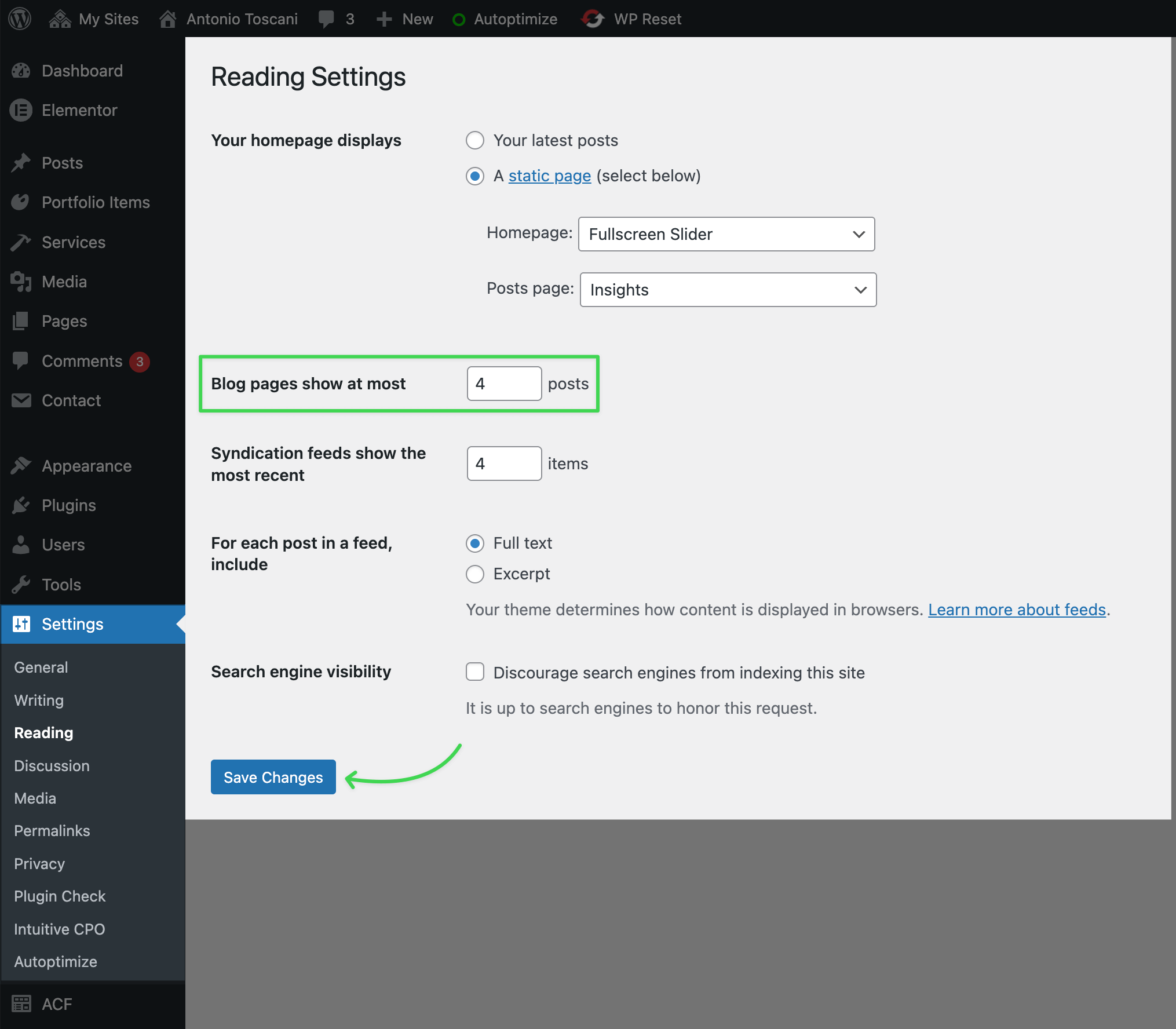 The number of posts per page is controlled in Settings → Reading → Blog pages show at most.