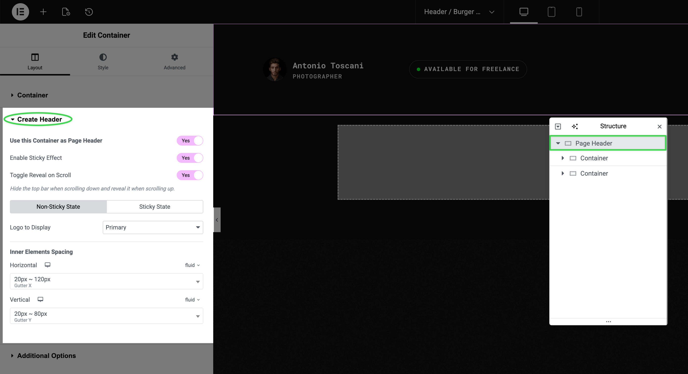 In the left sidebar, activate the Layout tab and expand the Create Header section.