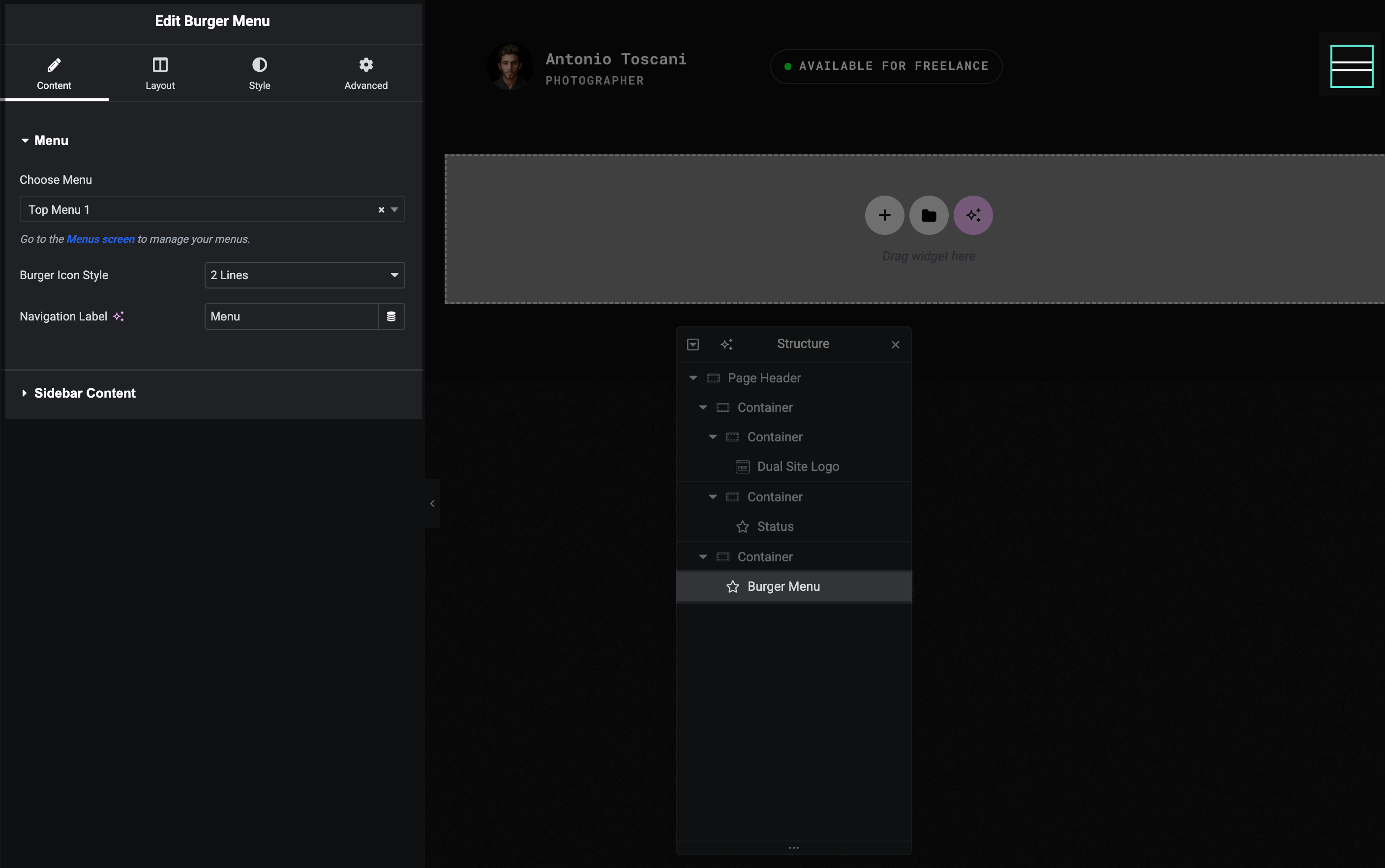 The Burger Menu widget is still present in Classic Menu headers for mobile devices — it's just hidden on desktop.