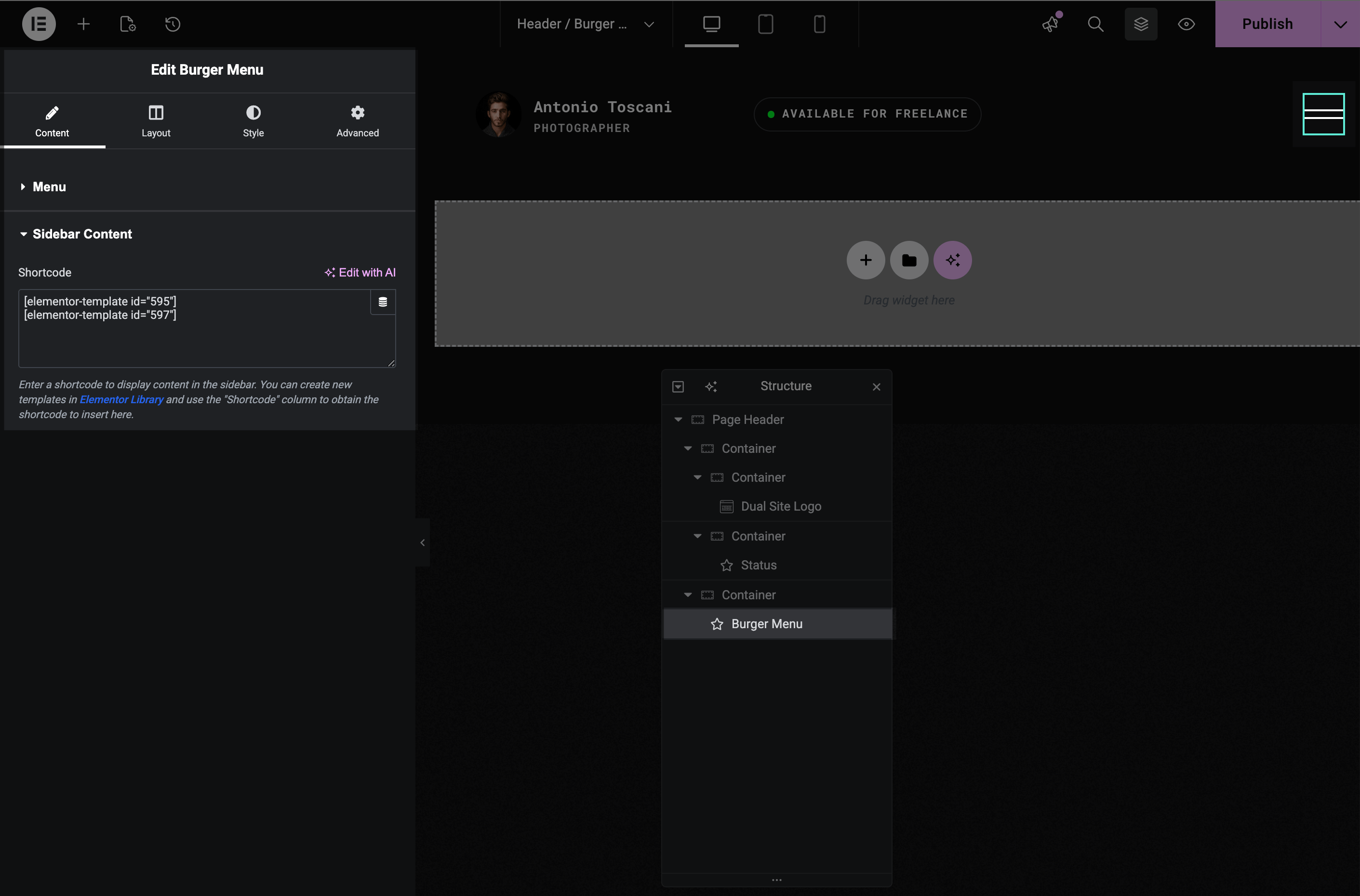 In the Burger Menu widget, find the Sidebar Content section and note the shortcode (e.g., [elementor-template id="595"]).
