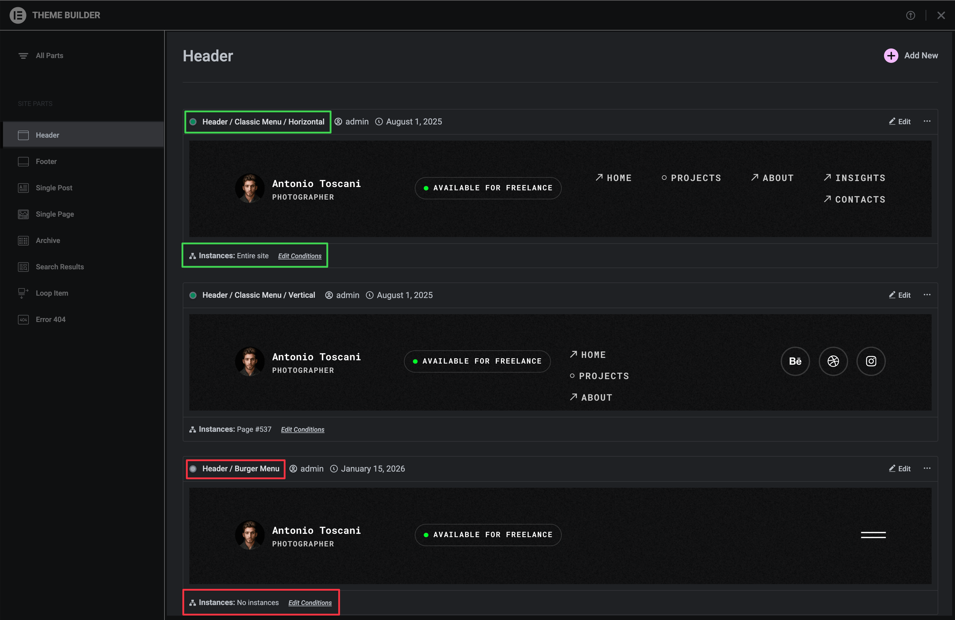 Only use one header container per page. Multiple headers may not work as expected — the theme is designed for exactly one header instance.