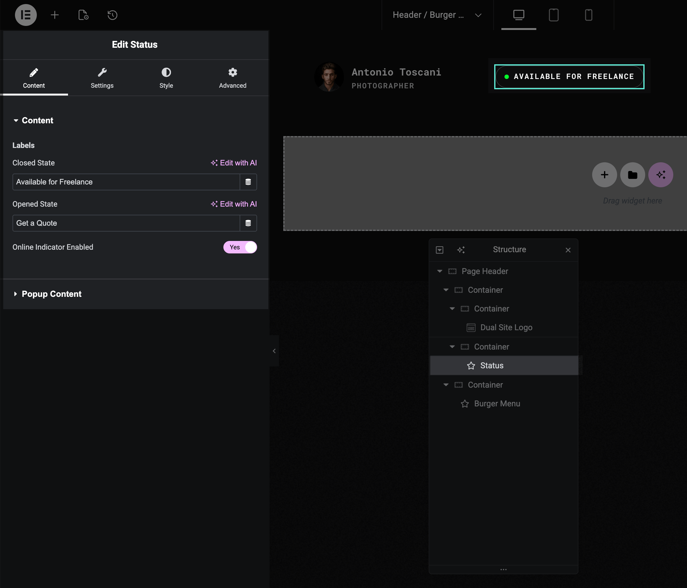 The Status widget shows a clickable label (e.g., "Available for Projects") that opens a popup with custom content — commonly a contact form.