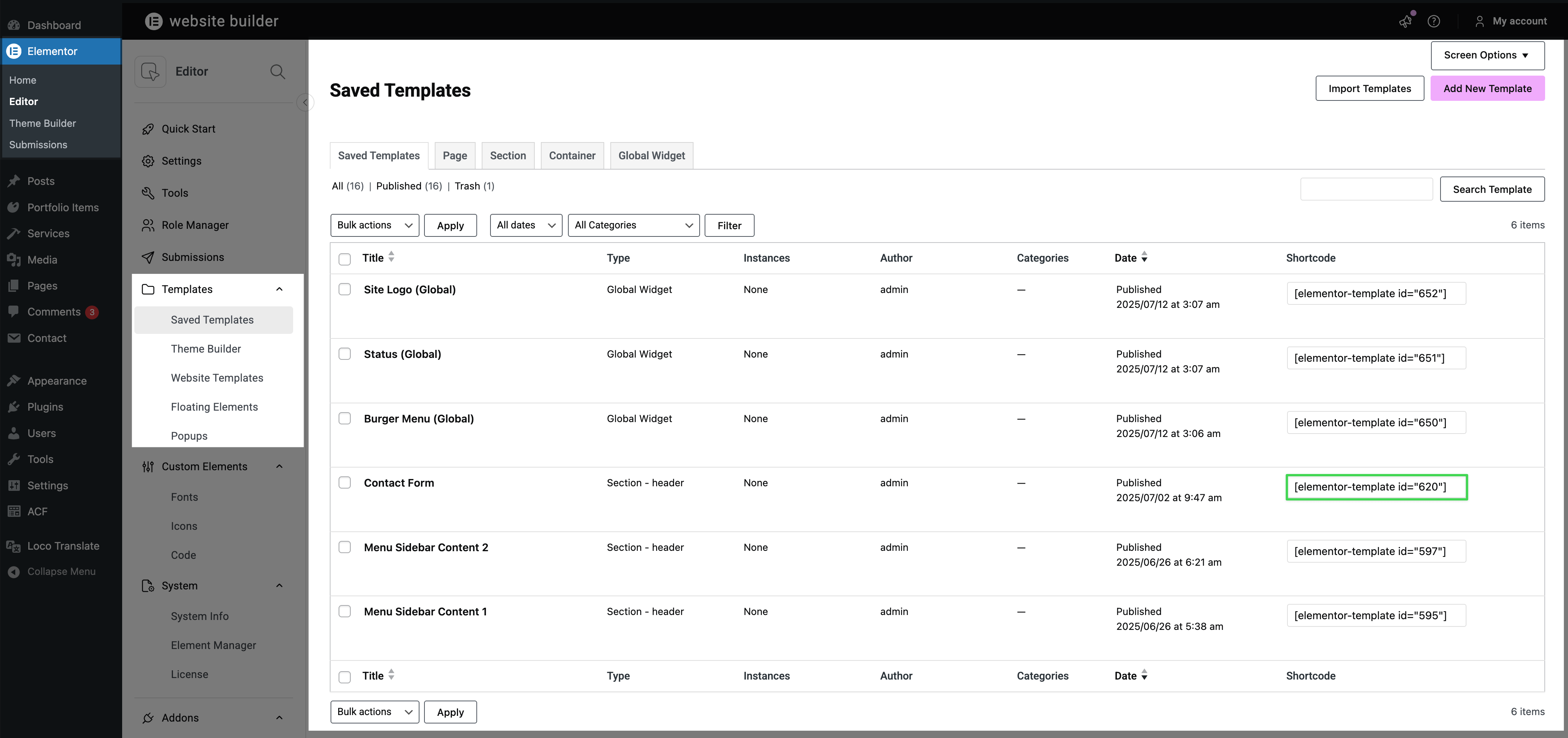 Note the shortcode (e.g., [elementor-template id="620"]).
