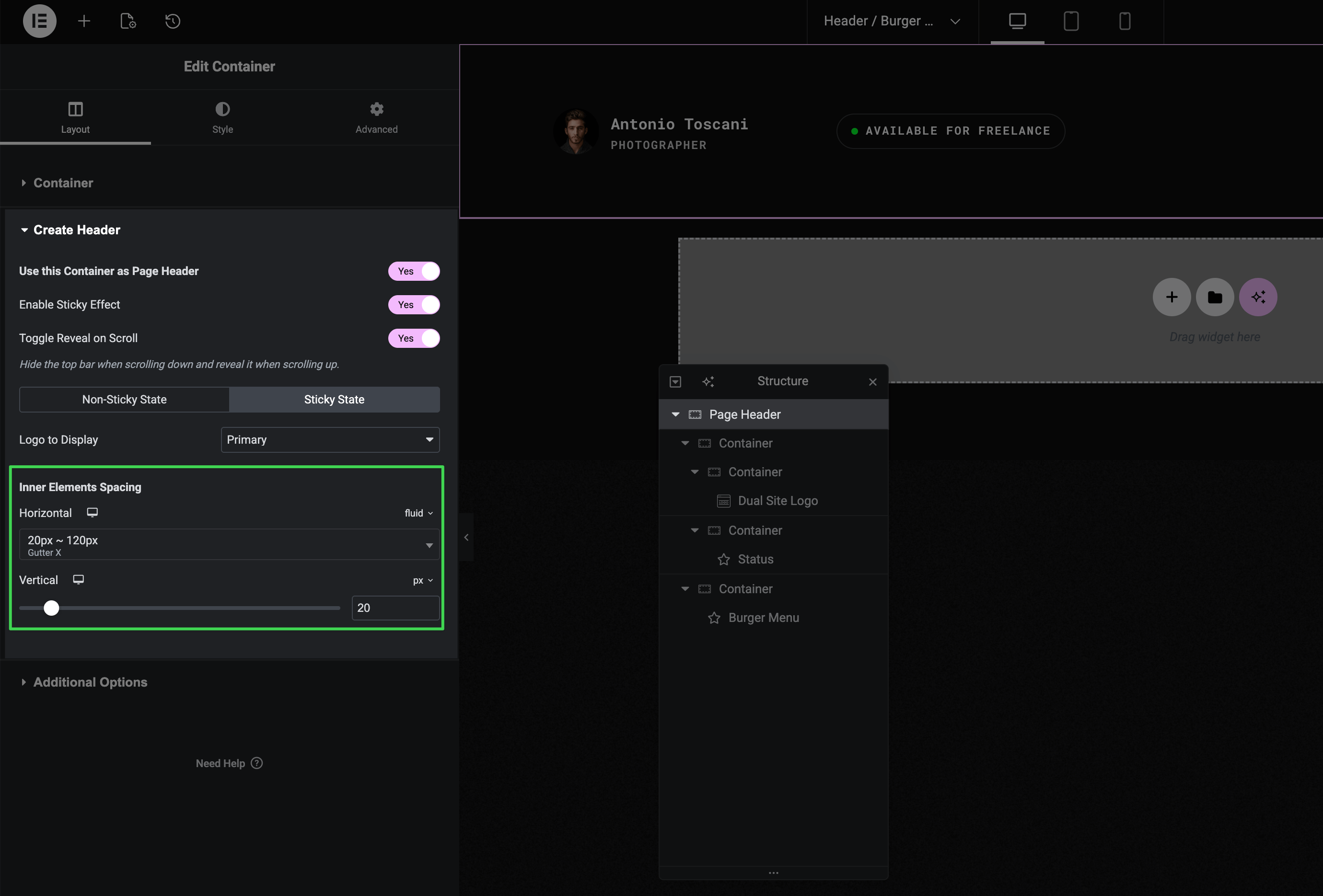 - Horizontal — controls horizontal space between header elements. Can use fluid presets (e.g.,