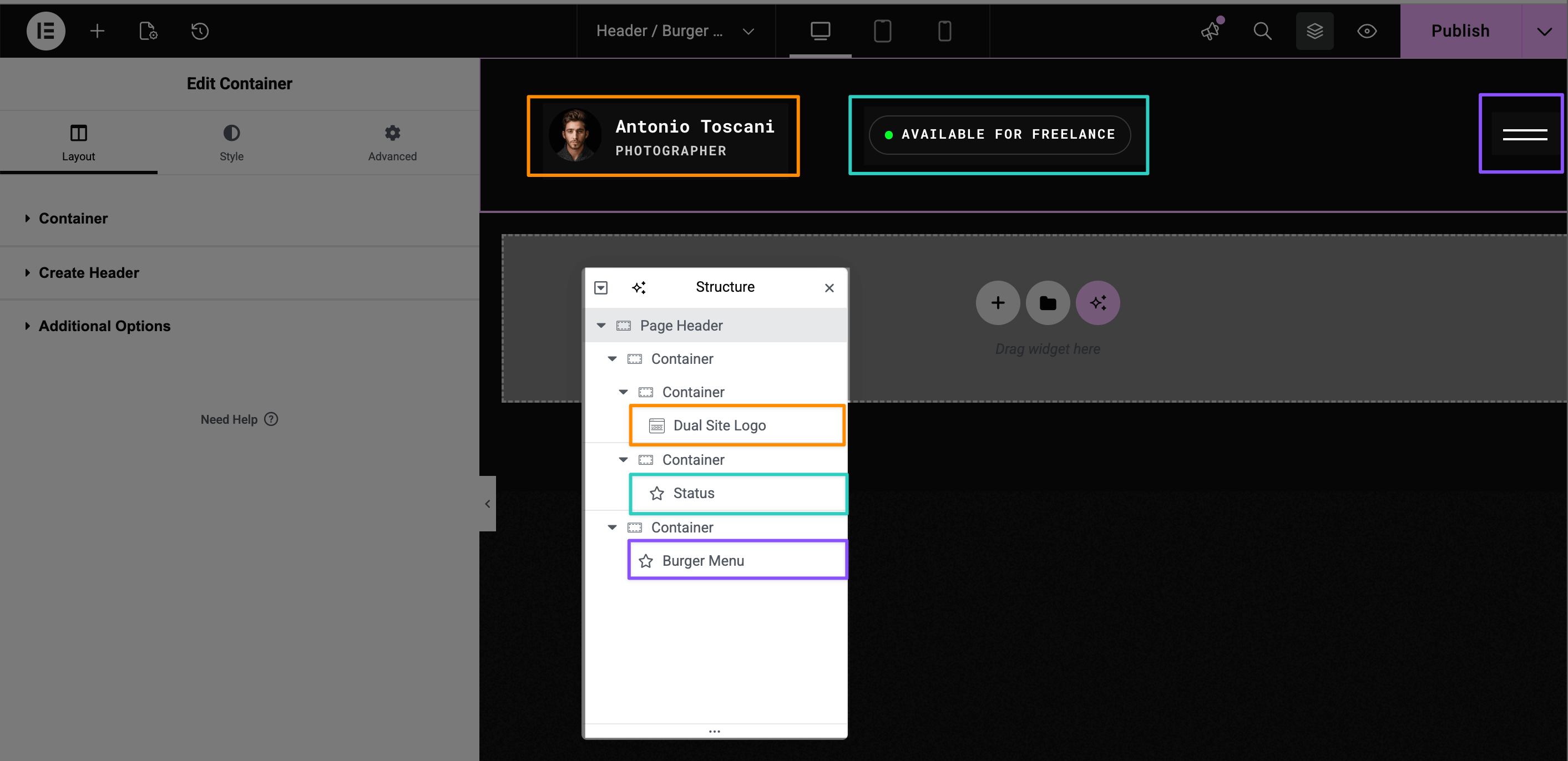 The Trigger header is built on an Elementor Container with several widgets inside: