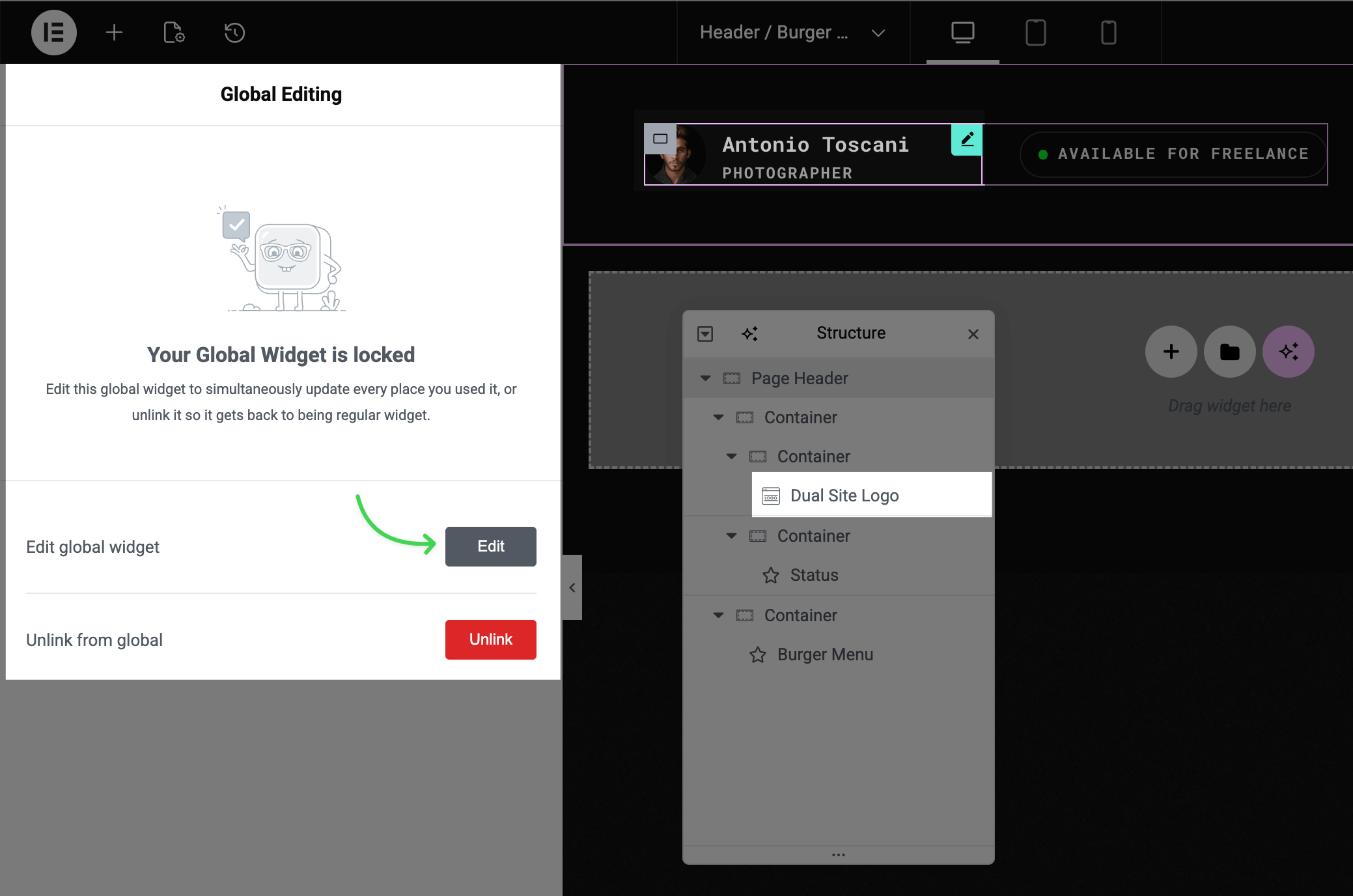 You can change button labels, URLs, add or remove social icons, or completely redesign the sidebar layout using any Elementor widgets.