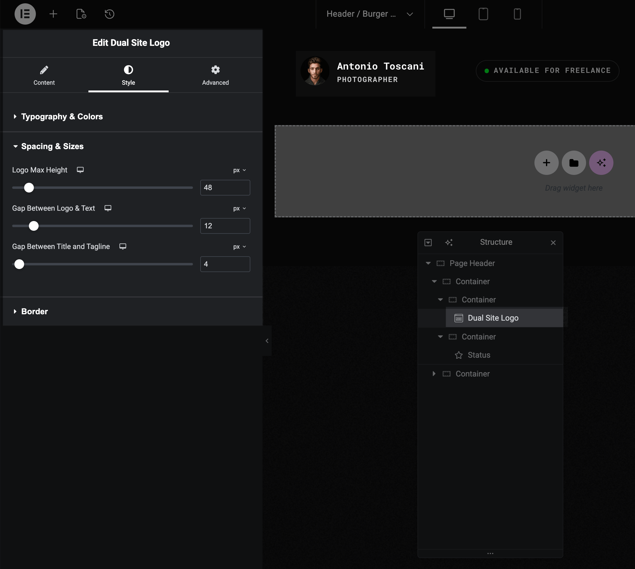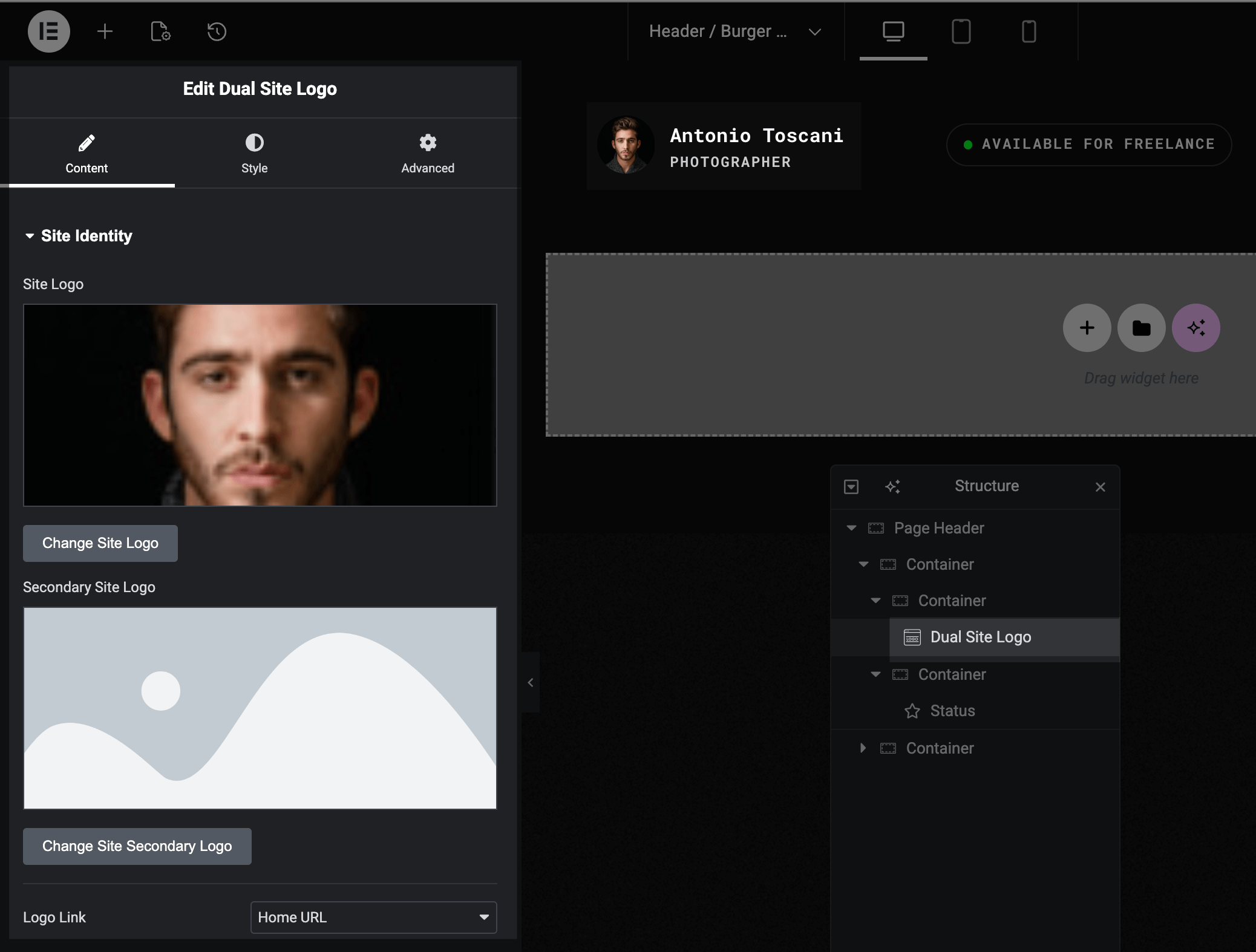 | Dual Site Logo widget | Displays your logo with optional light/dark variants |