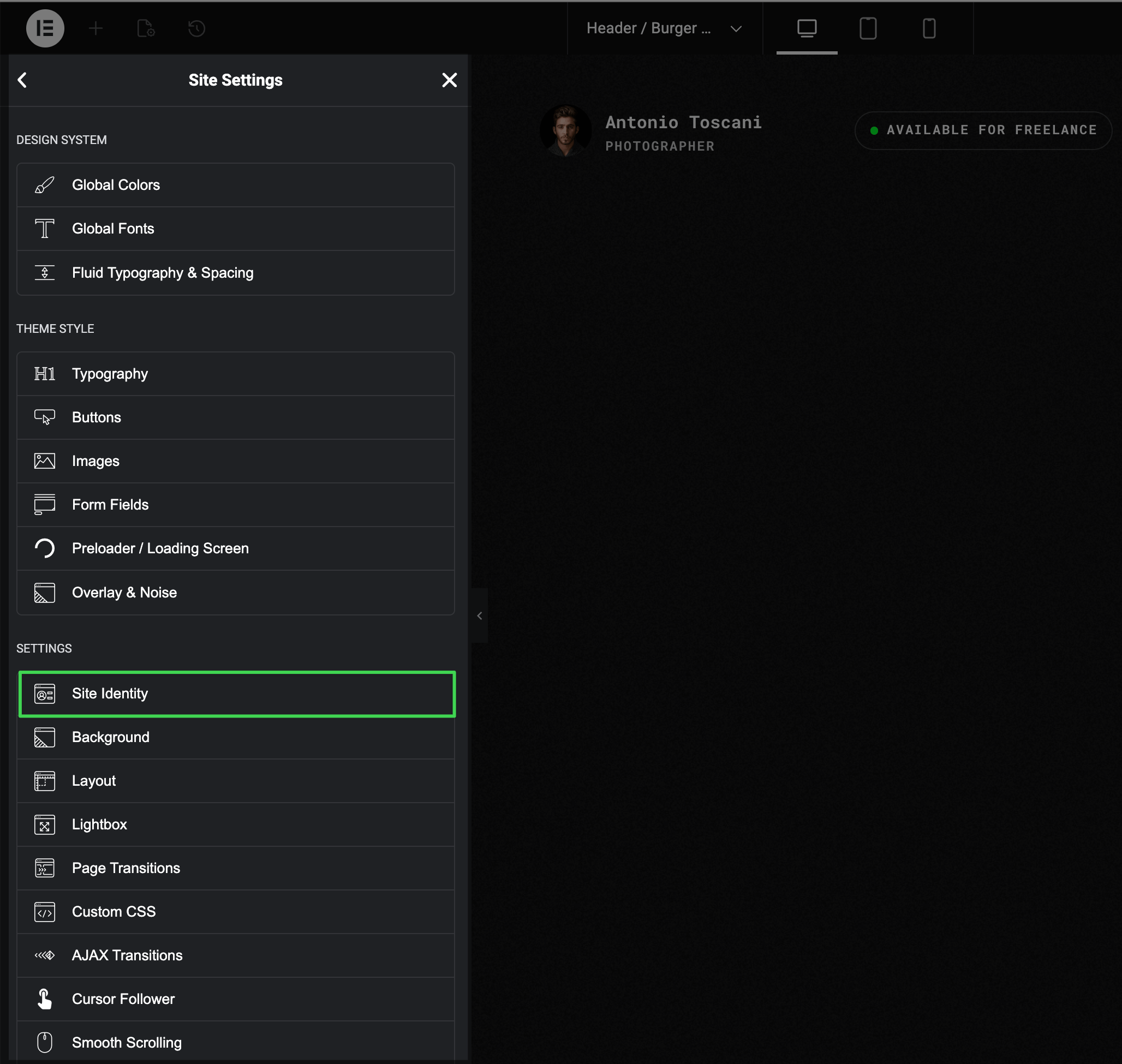 Open Site Settings in Elementor (see Accessing Theme Options Panel).