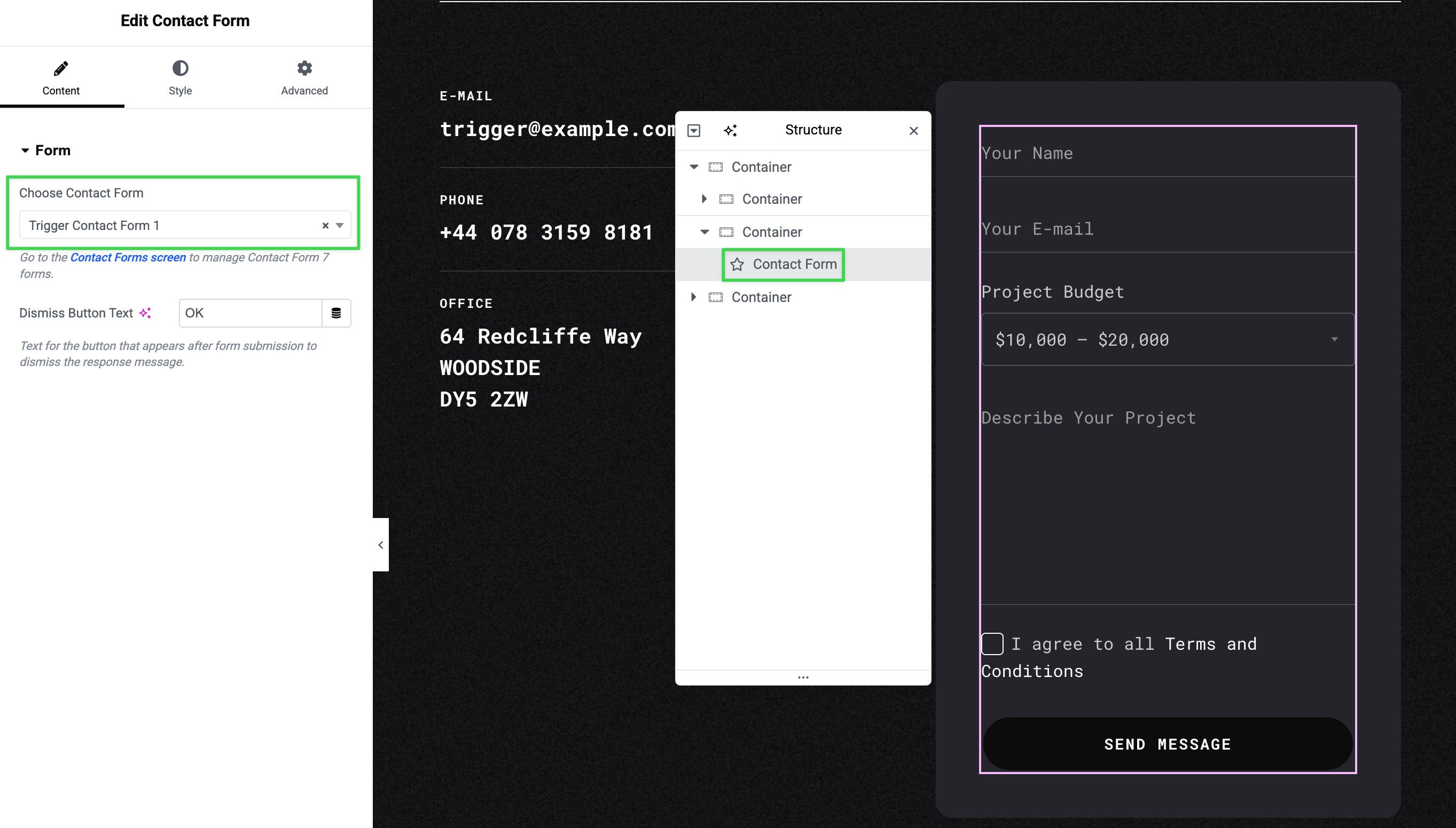 Trigger includes a dedicated Contact Form widget for Elementor—simply select your form from a dropdown instead of copying shortcodes.
