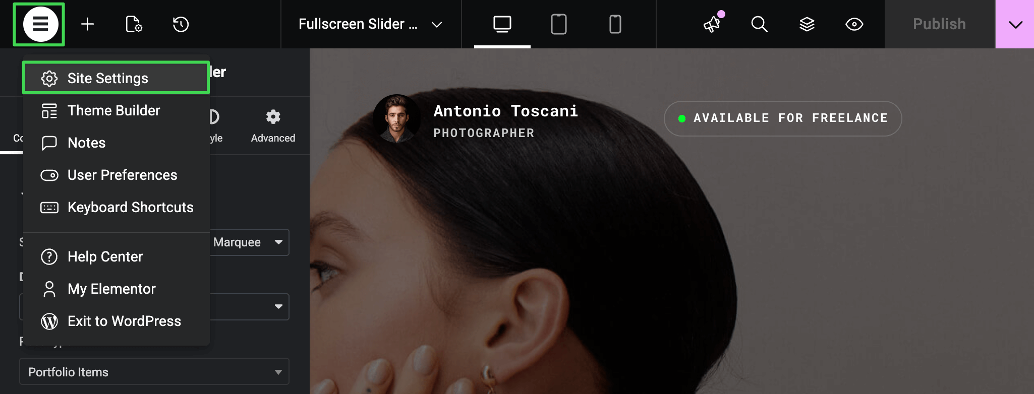 In the editor, click the burger icon at the top left and select Site Settings from the dropdown.
