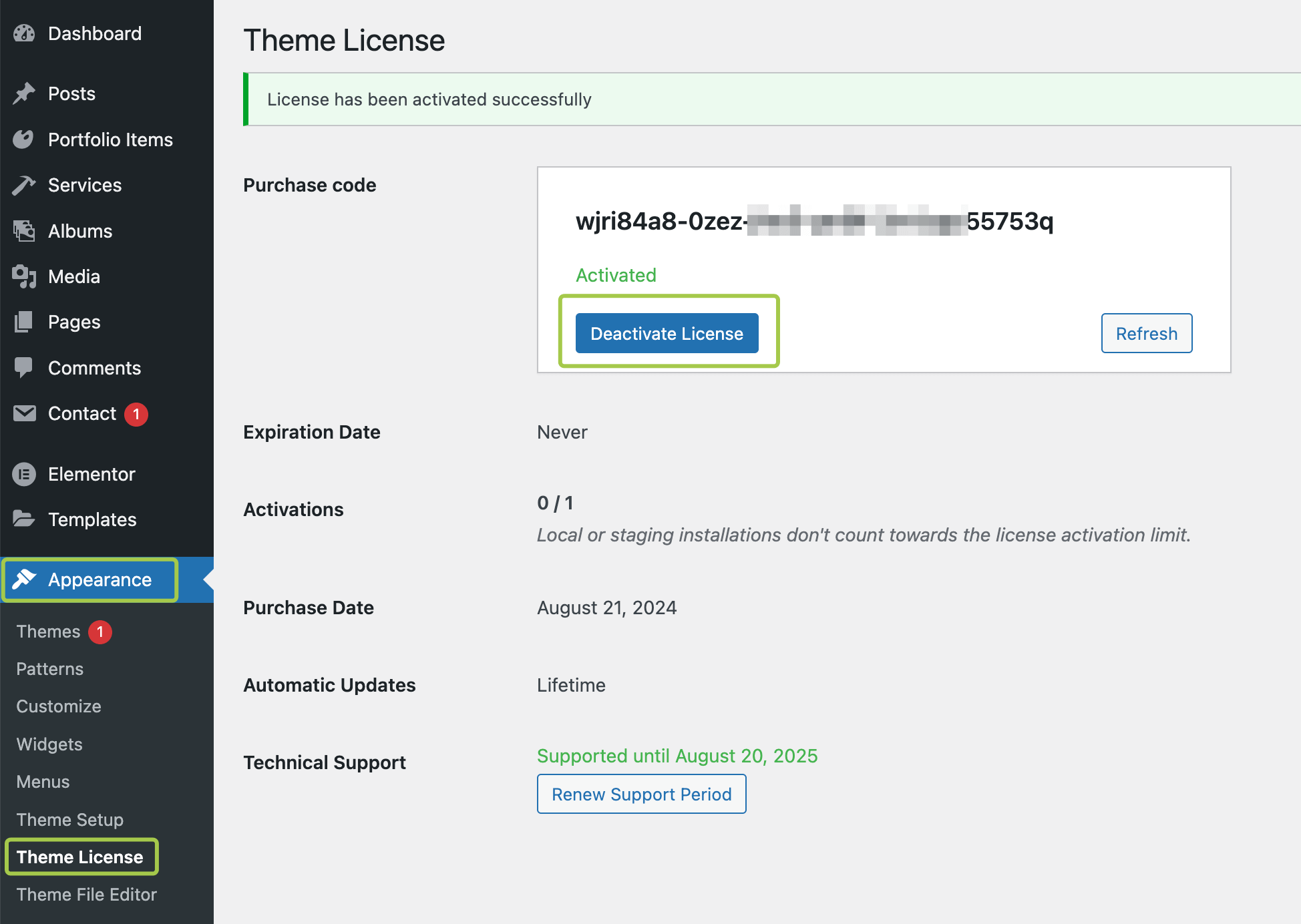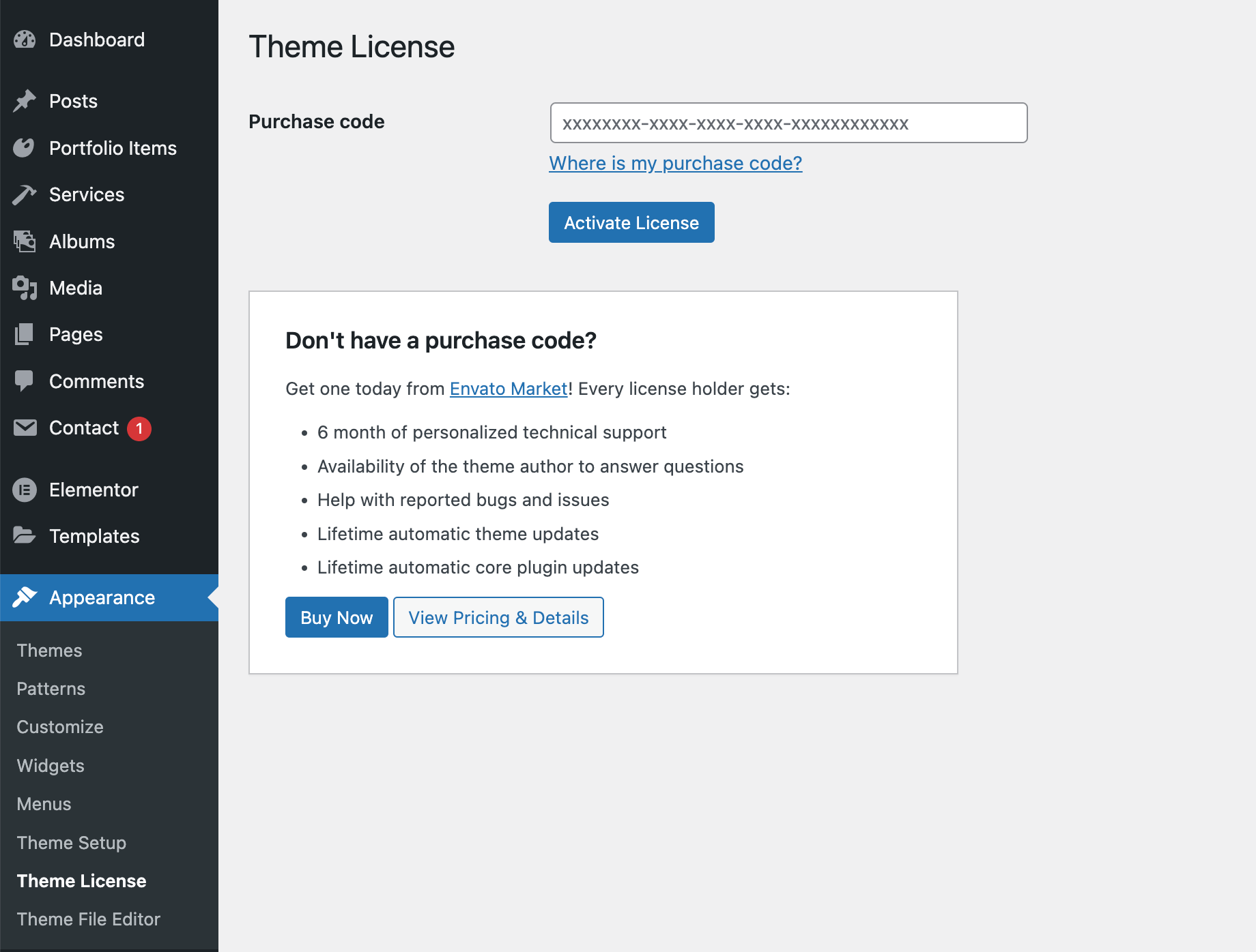 WordPress Admin → Appearance → Theme License. - Enter your purchase code and click