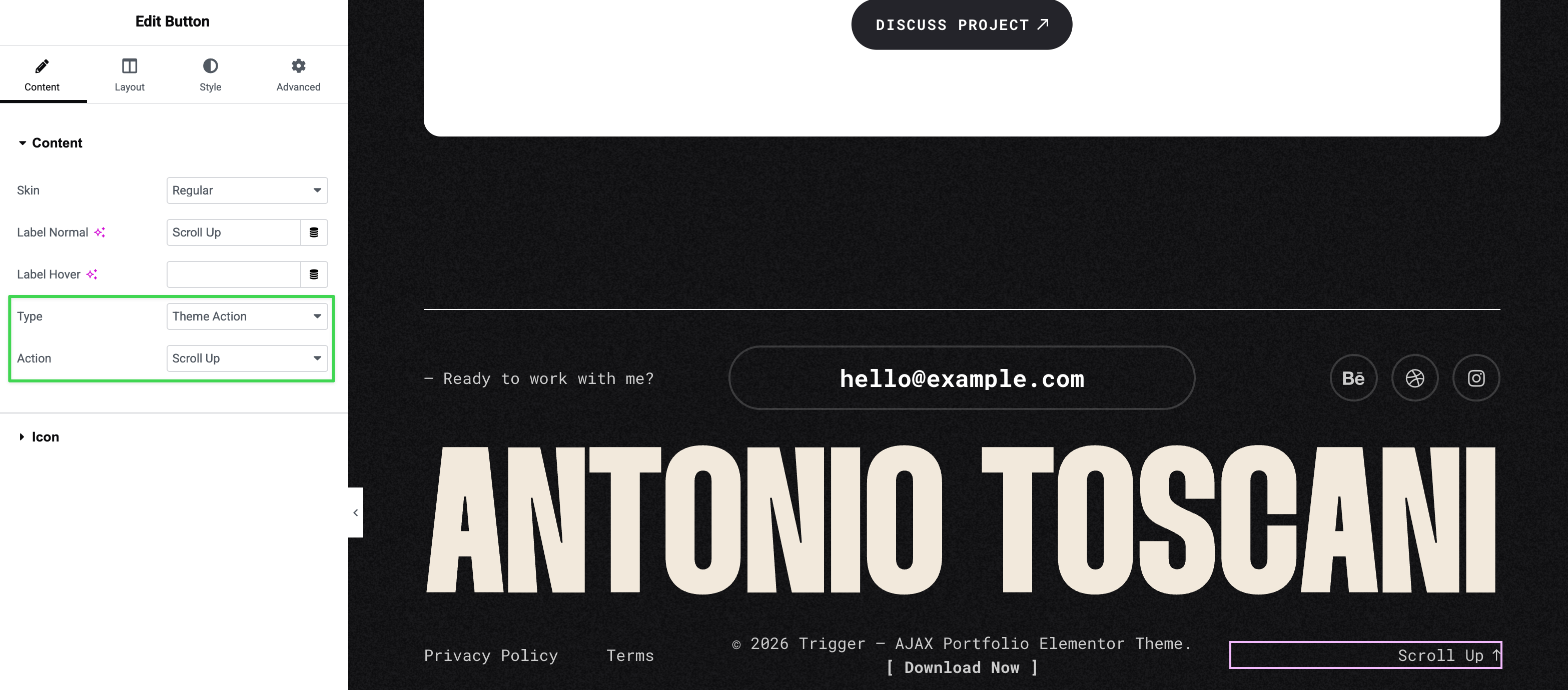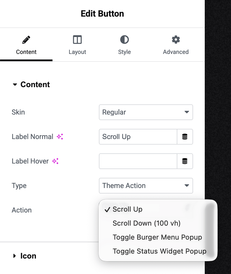 The Button widget includes a Theme Action type that provides pre-configured interactive behaviorsβno coding required.