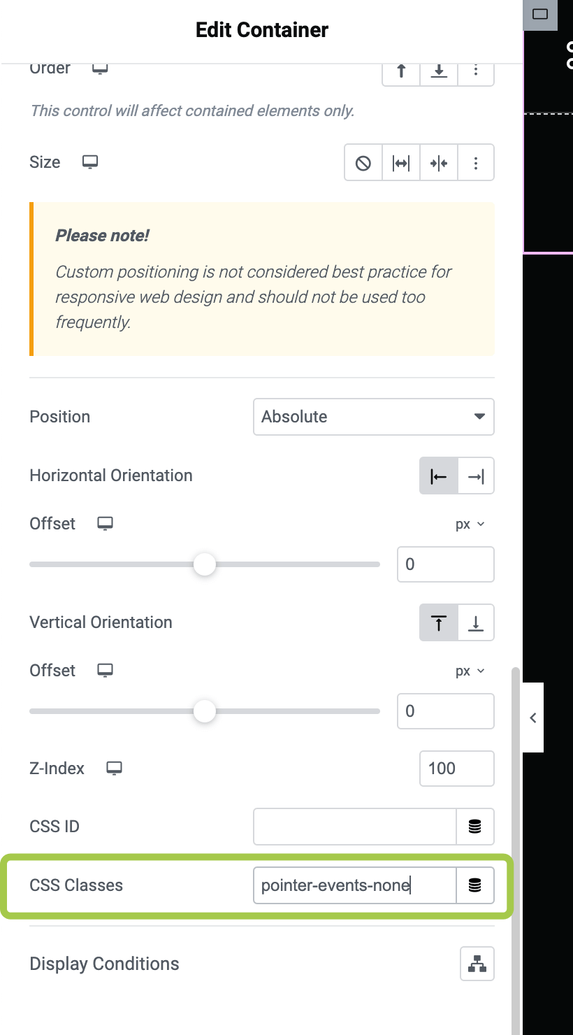 The theme includes utility classes for controlling pointer events on elements. Add these classes in the Advanced tab under CSS Classes.